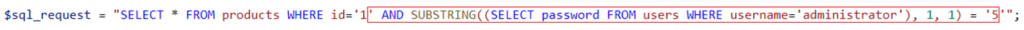Ainsi, avec l’injection suivante par exemple, si nous gardons notre exemple d’injection dans l’ID du produit, on pourra savoir si le premier caractère du mot de passe de l’utilisateur « administrator » de la colonne « password » de la table « users » est égal à « 5 » ou non :