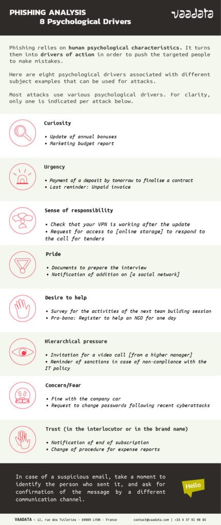 Most attacks use various psychological drivers. For example, if we take the third pretext: “Payment of a deposit before tomorrow to finalise a contract”, there are many psychological drivers that can be used by attackers to persuade the targets to click: