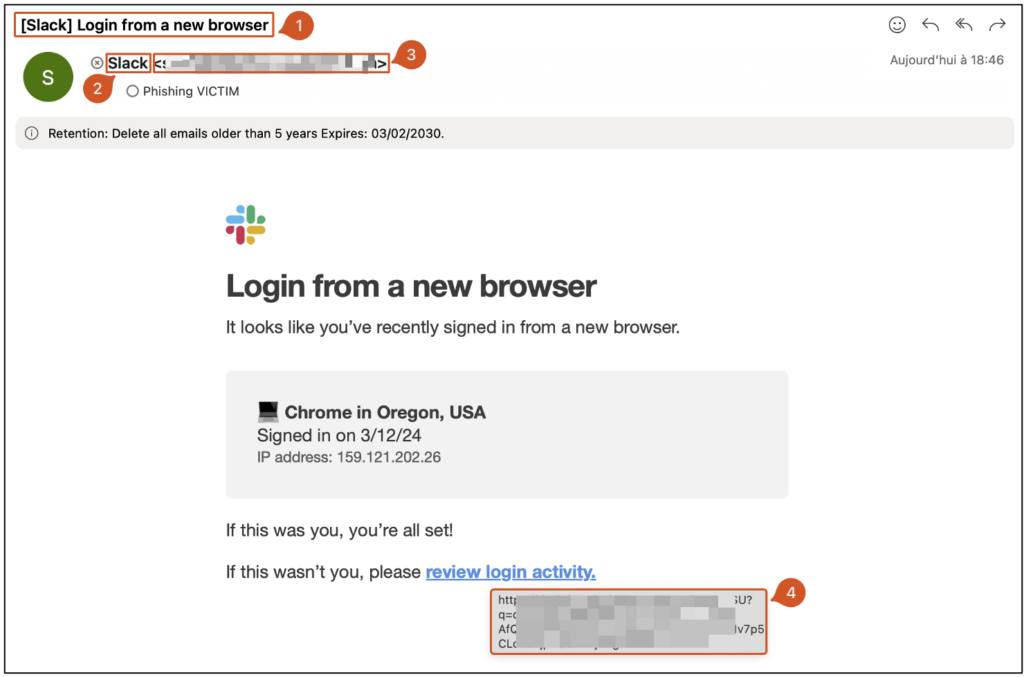 - The embedded link (4): The redirection address does not point to slack.com but to a fraudulent domain designed to capture login details. Particular vigilance over the links contained in emails is crucial to avoid this type of attack.