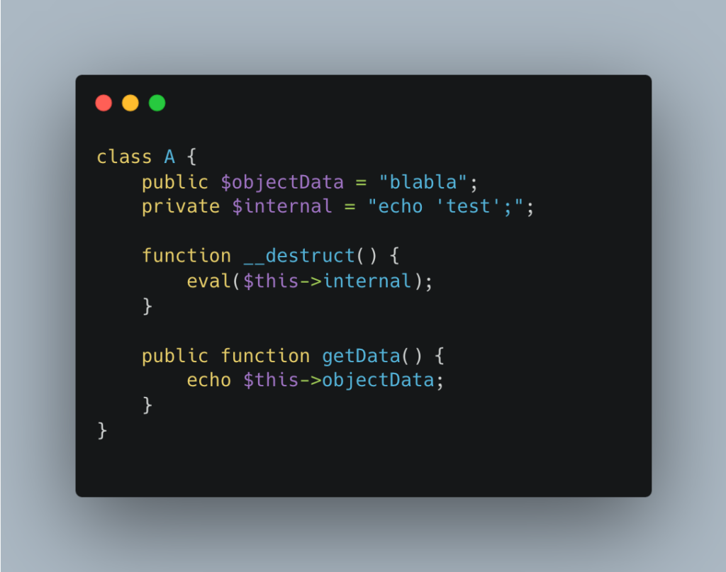 Here, the __destruct() function is a critical vulnerability: it arbitrarily executes the contents of the private internal attribute via eval().