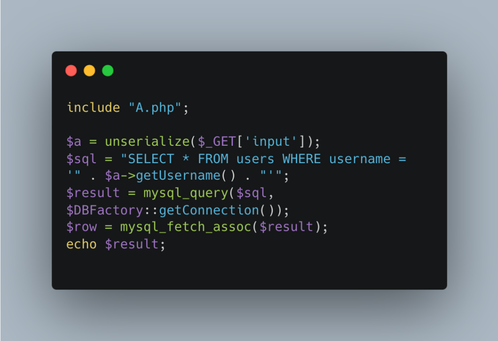 __destruct(),__wakeup(), etc.). - Bypass protections and inject malicious code into other parts of the application (such as an SQL query).