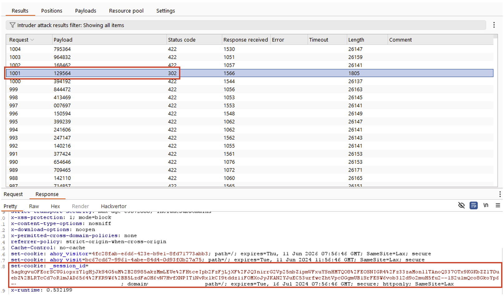 However, the application was not protected by any form of rate limiting. It was therefore possible to take advantage of the fact that a 6-digit code represents only 1 million combinations – a small number for a brute force attack.