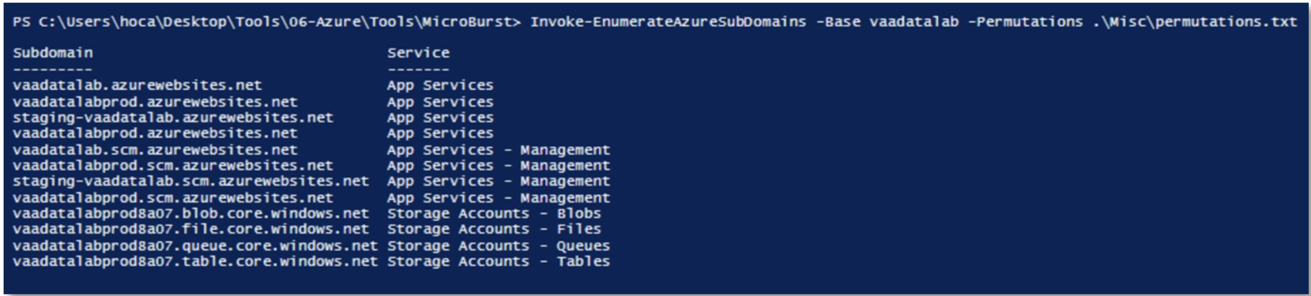 Invoke-EnumerateAzureSubDomains -Base vaadatalab -Permutations .permutations.txt