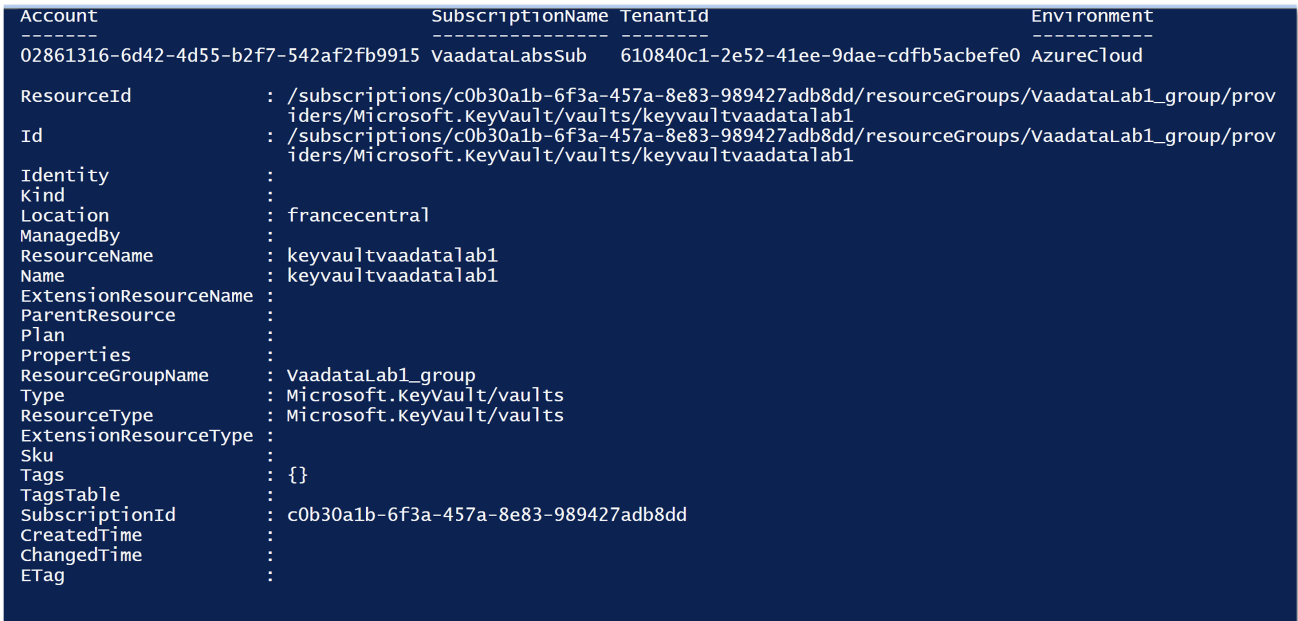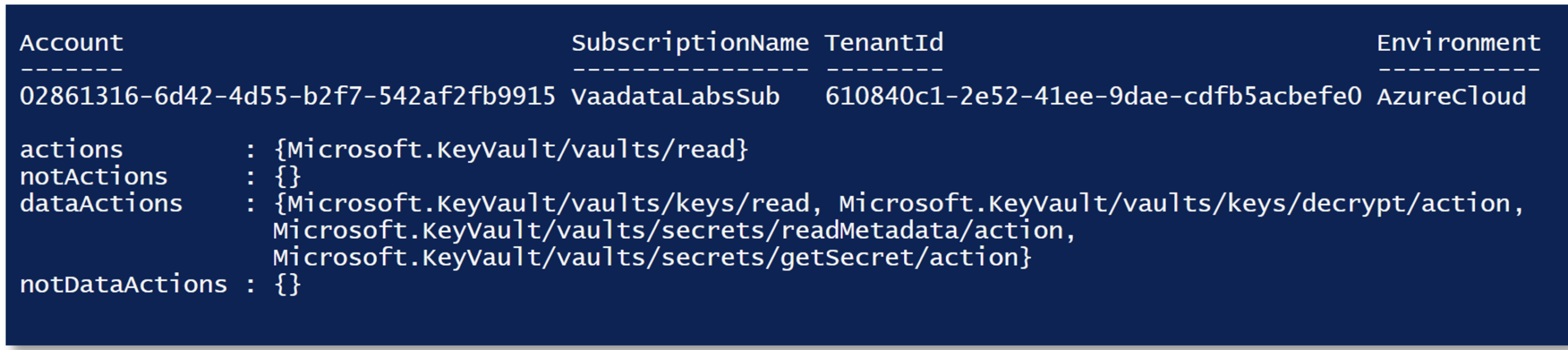 So we can see that we can access a Key Vault named ‘keyvaultvaadatalab1’.