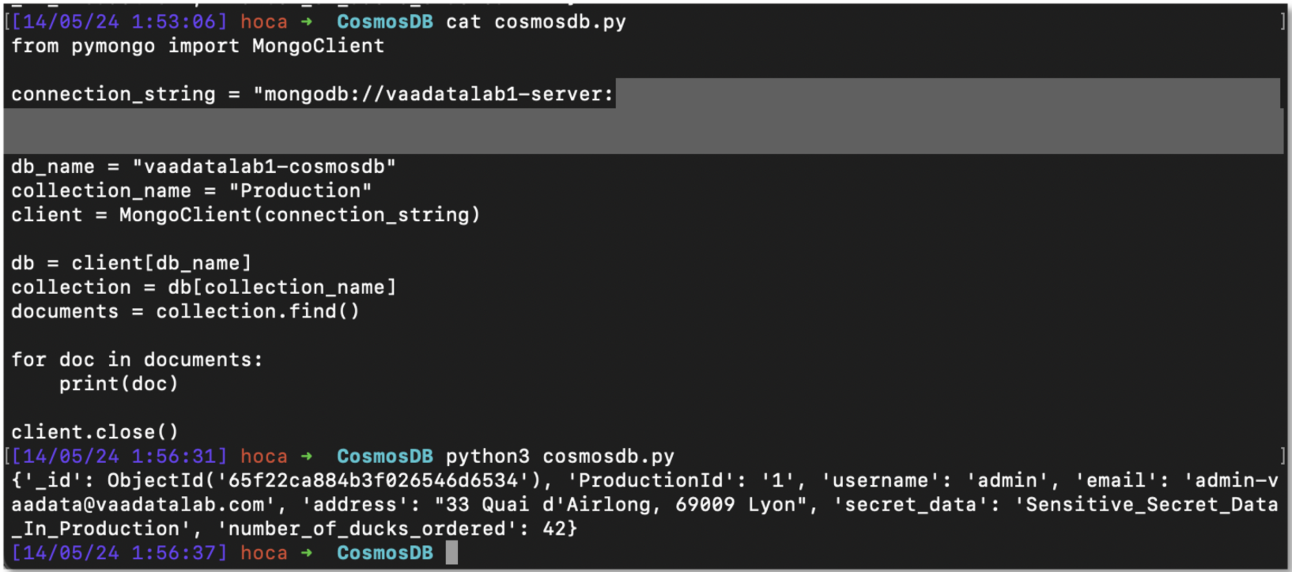 With this connection String, we can access all the production data contained in the CosmosDB.