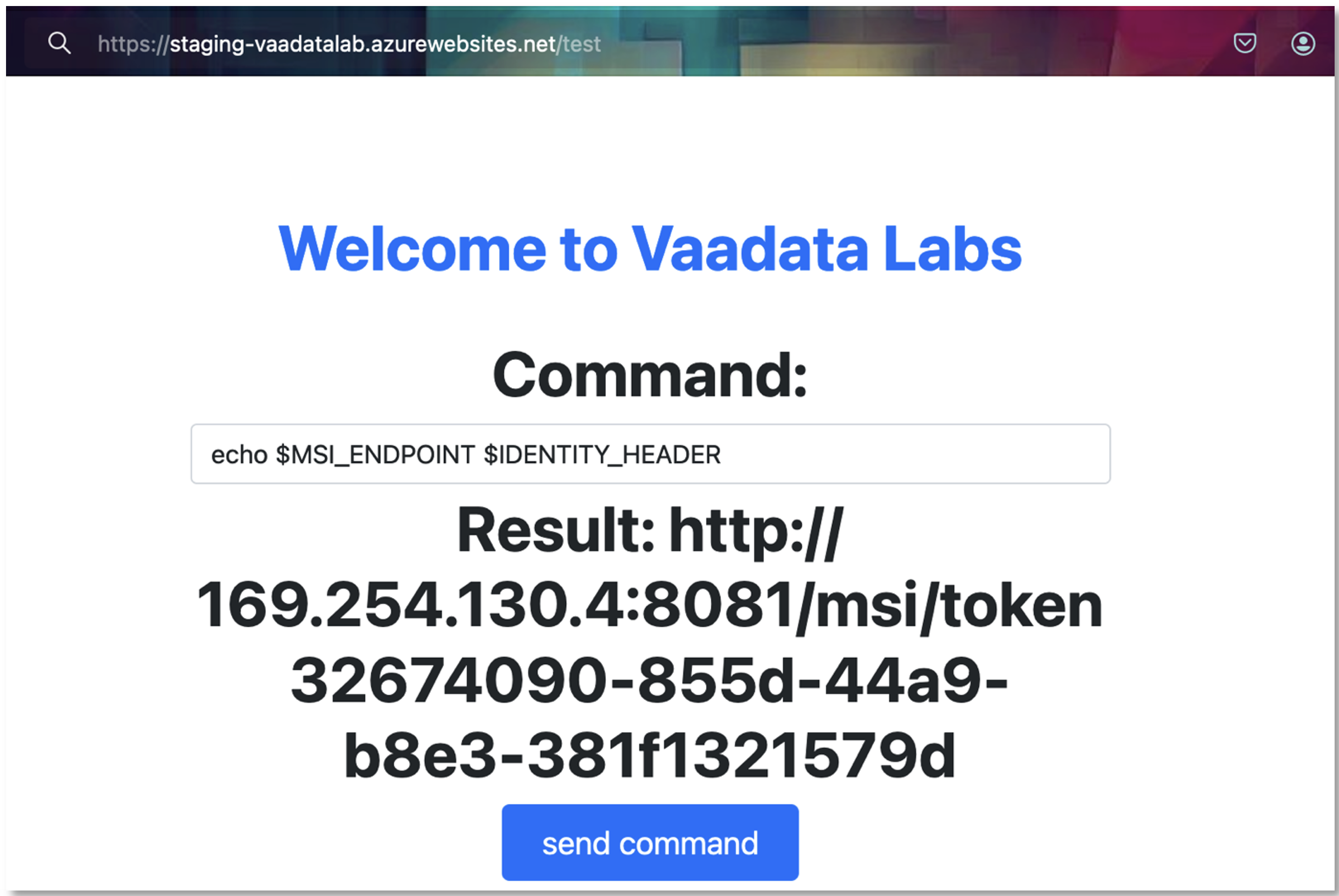 There are two ways of authenticating with a Service Principal from a compromised application. The first is to find an ‘identifier:secret’ pair in a configuration file. The second involves sending an HTTP request to the MSI_ENDPOINT using IDENTITY_HEADER as the secret.