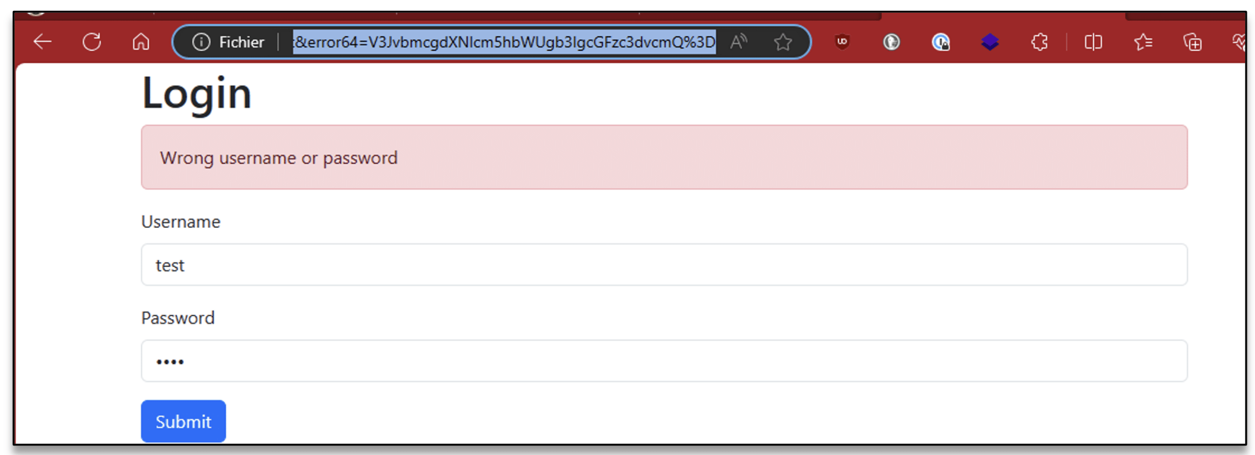 After sending the request, he noticed that an “error64” parameter had been added to the URL of the page. The content of this parameter actually contained the value of the error message encoded in “base64”.