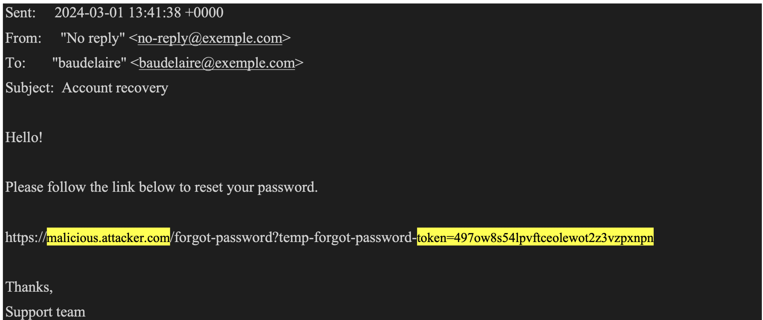 By clicking on the link in the email, the user will actually target the attacker’s server and disclose the content of the password modification link.