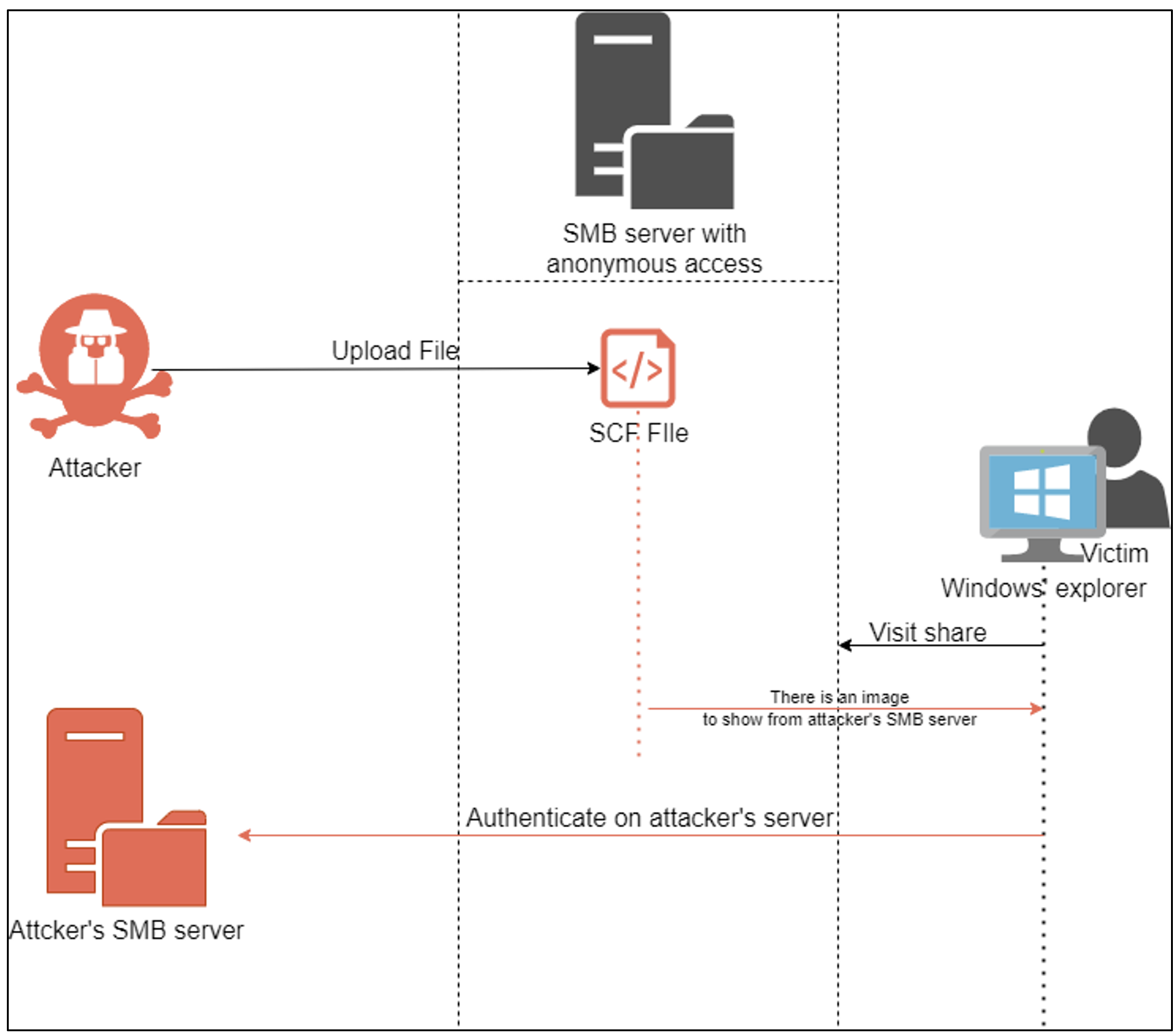 The success of such an attack allows the attacker to gain illegitimate access to the targeted file share. If the compromised user is an administrator of the machine, then the attacker will gain system access to the target machine.