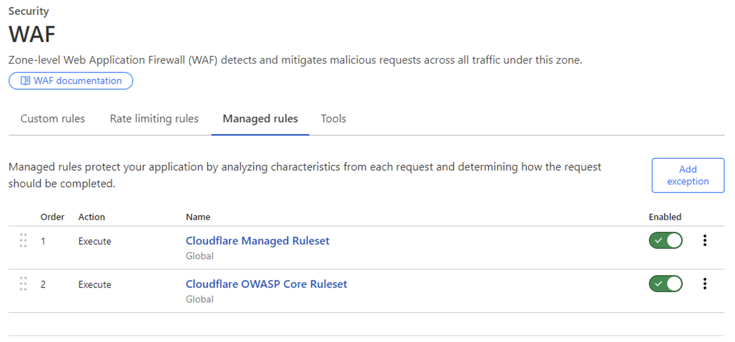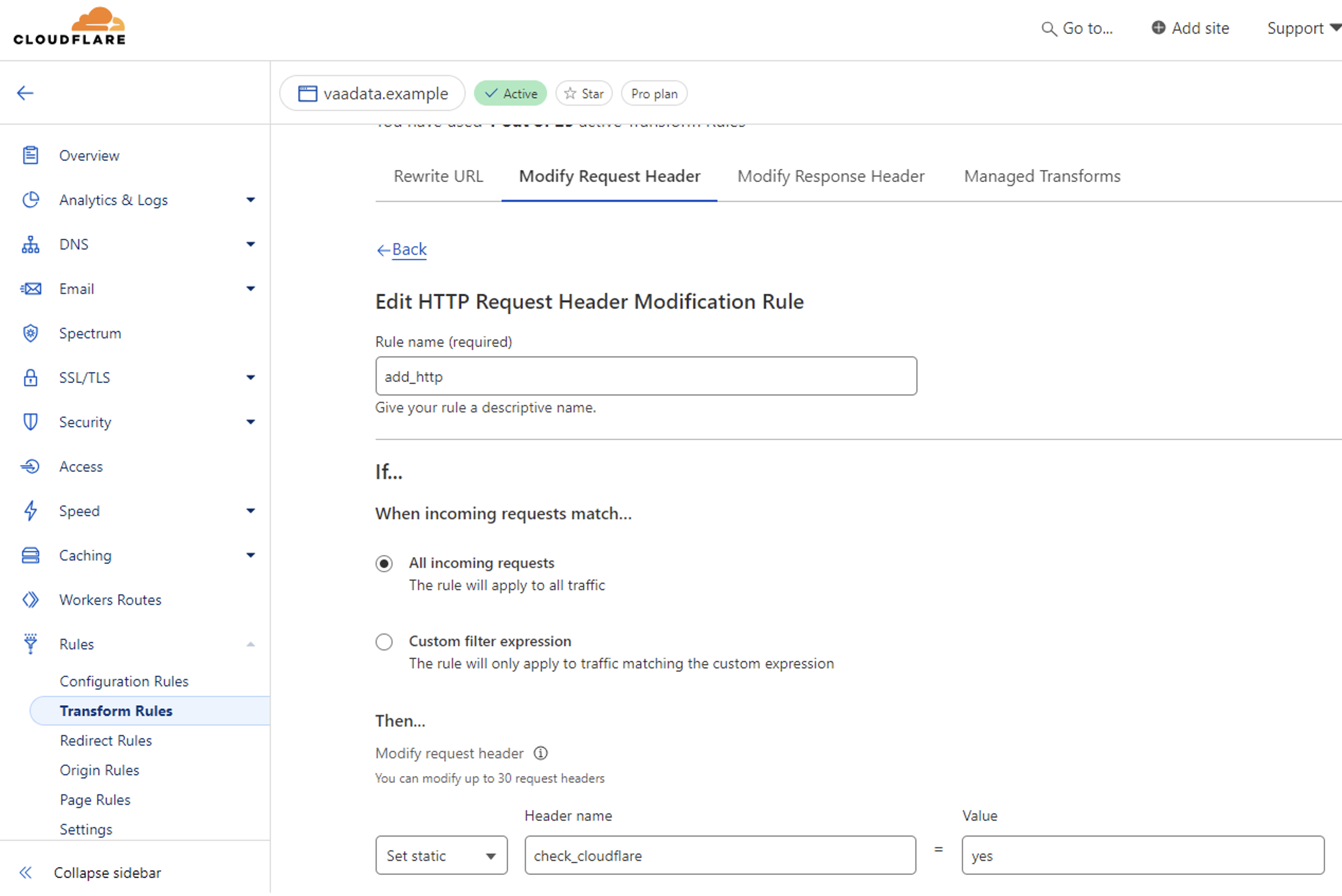Here, although traffic from ‘vaadata.example’ passes through Cloudflare, no specific rules have been defined on Cloudflare’s Web Application Firewall (WAF).