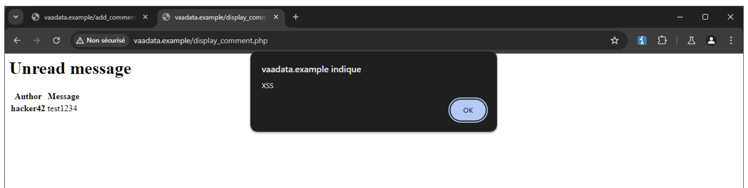 author=hacker42&message=test12345<script>alert('XSS')</script>