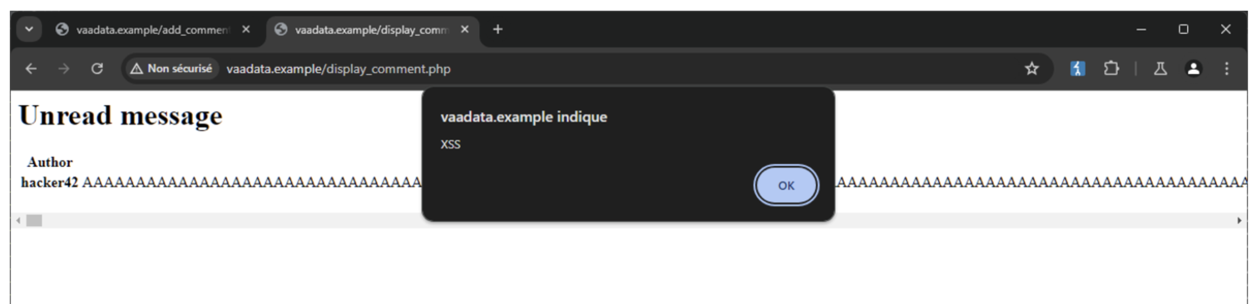 author=hacker42&message=AAAAAAAAAAAAAAAAAAAAA[…TRUNCATED DATA]AAAAAAAAAAAAAAAAAAAAA <script>console.log('XSS')</script>