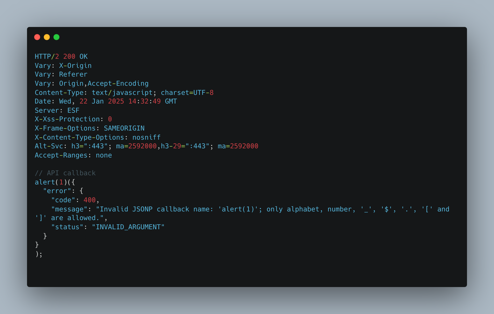 In the example given, the URL https://accounts.google.com/o/oauth2/revoke corresponds to a known JSONP endpoint. By sending a request with a callback parameter, the server responds with JavaScript, making it possible to inject a malicious payload. Here is an example of a request that triggers this JavaScript response: