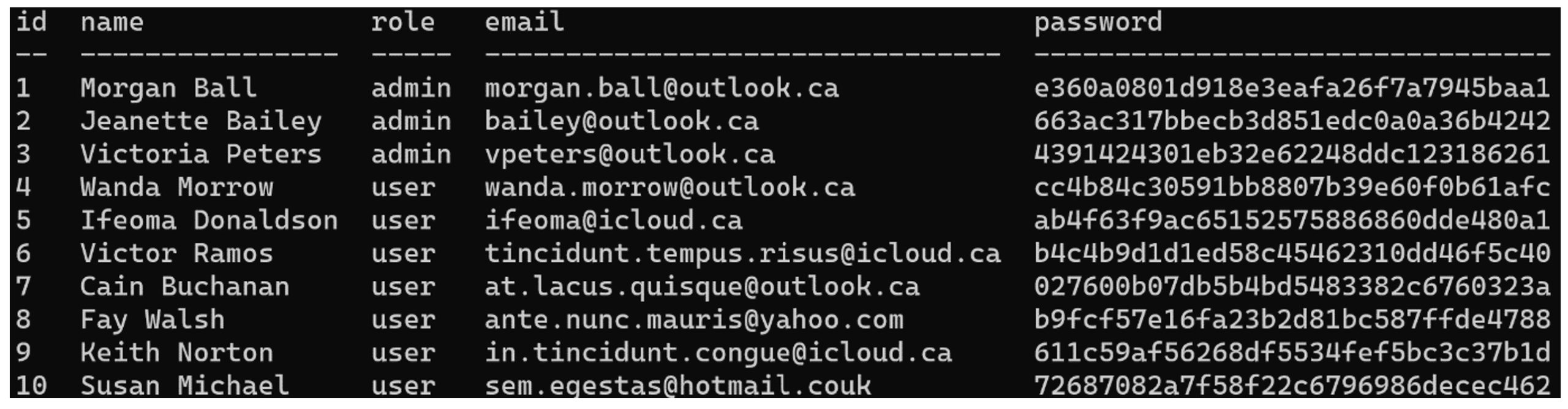 The data in the user table that we have retrieved through the SQL injection is as follows (for this example, the data has obviously been replaced by mock-ups):