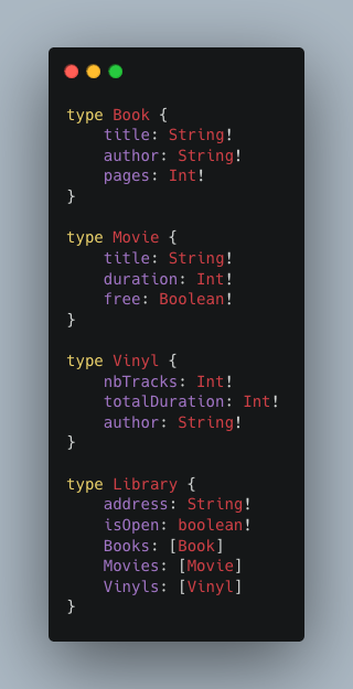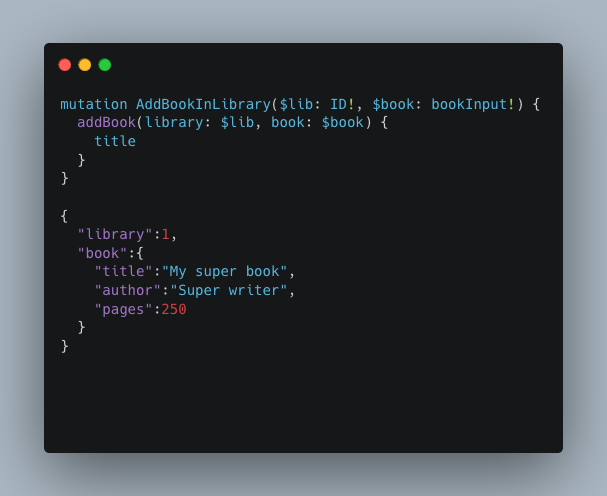 This mutation allows us to add a book to a library. AddBookInLibrary specifies the expected fields for this mutation, and addBook is the field that will be executed.
