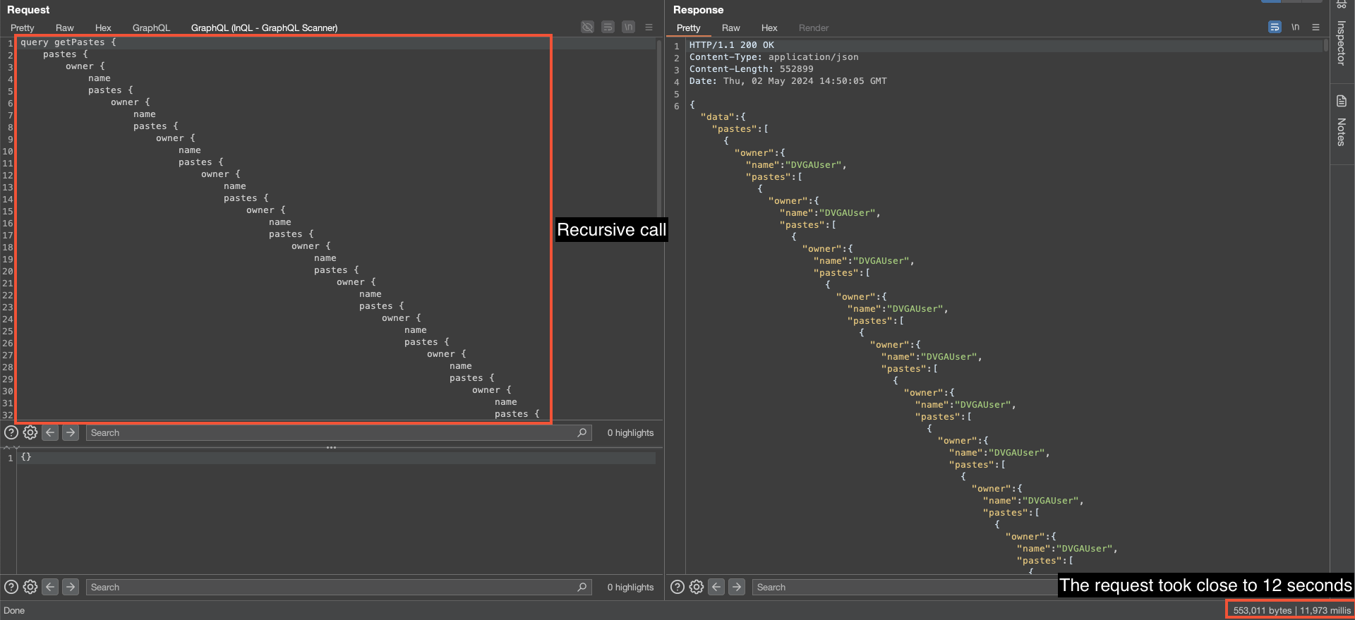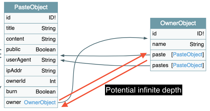 When we make a getPaste request referencing an owner, itself referencing pastes, and so on, this request can become extremely heavy for the server. Such a structure risks compromising the smooth running of the application.