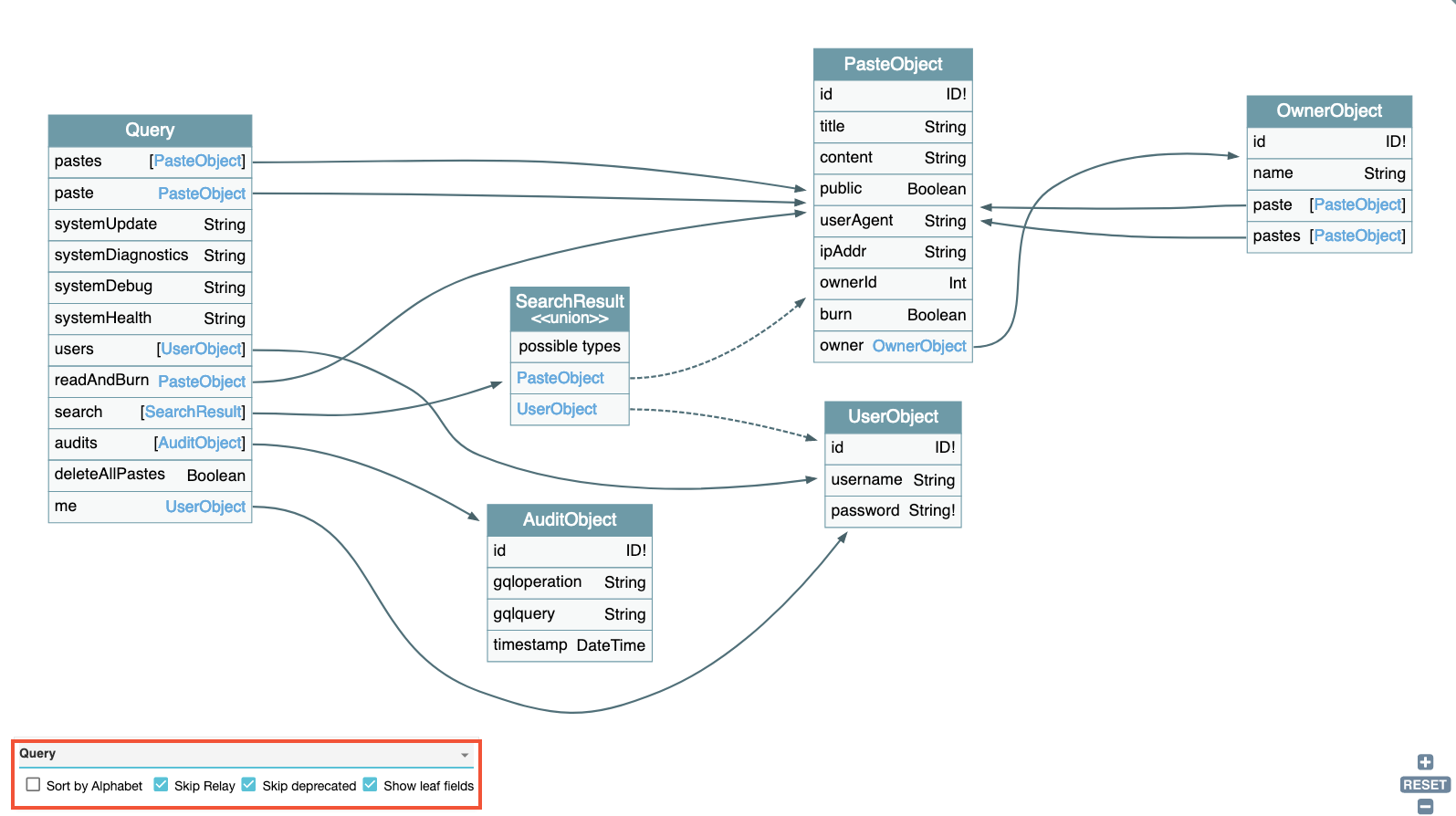 Once the schema has been loaded, the tool will generate a graphical representation of the schema structure. All types, fields and relationships are displayed, making it much easier to understand the API architecture.
