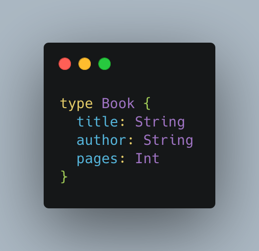 The following example illustrates the use of scalar types to define the Book object, which has three fields of types String, String and Int respectively: