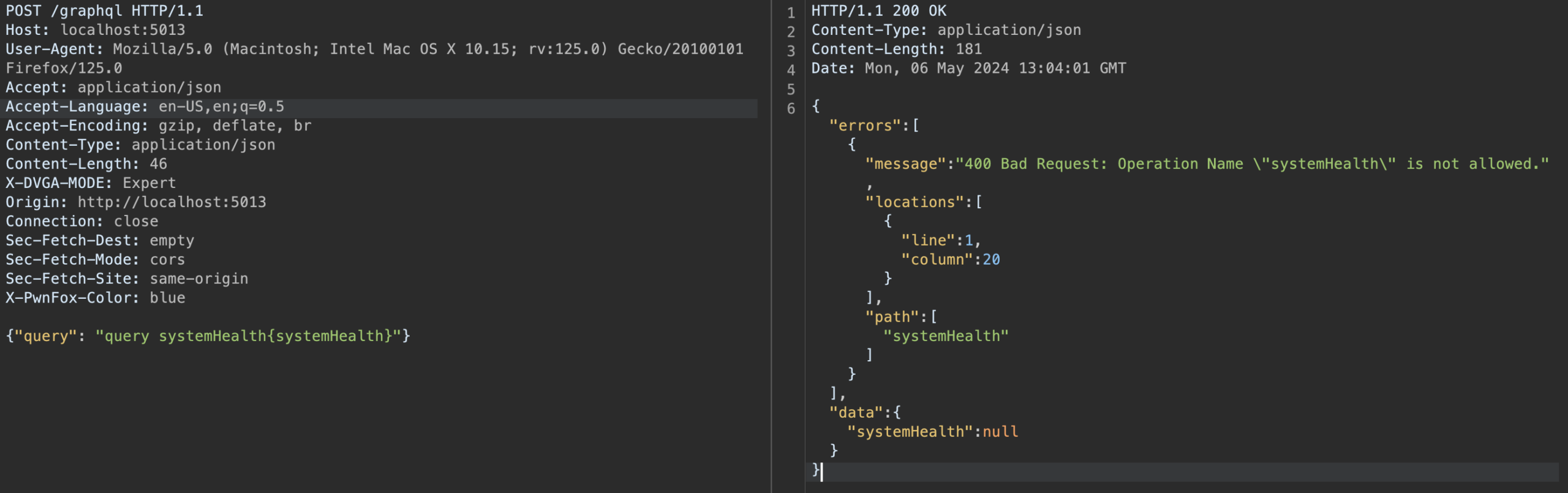 Consider a GraphQL API that exposes a systemHealth request that checks the state of the server. This request requires authentication as an administrator. Without a valid authentication token, the request is rejected, which is expected behaviour.