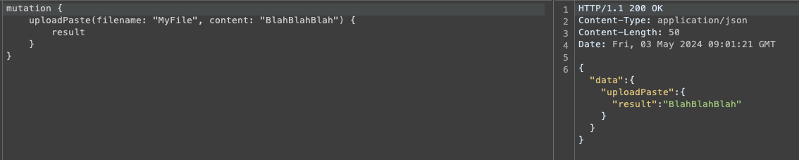 During our exploration we discovered a mutation that allows files to be uploaded to the server. This mutation expects 2 input fields, the name of the file and its content, and will return the result.