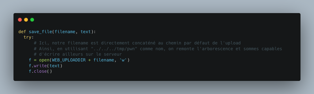 If we look at the source code responsible for saving our file, we can see that there is no check on the file name, which explains its presence in the other folder.