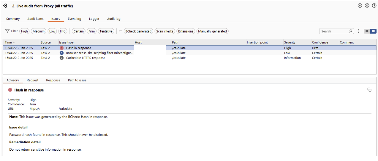 When a BCheck is triggered, an alert is displayed on the Burp Suite dashboard according to the message configured, making it possible to report the leak of secrets.