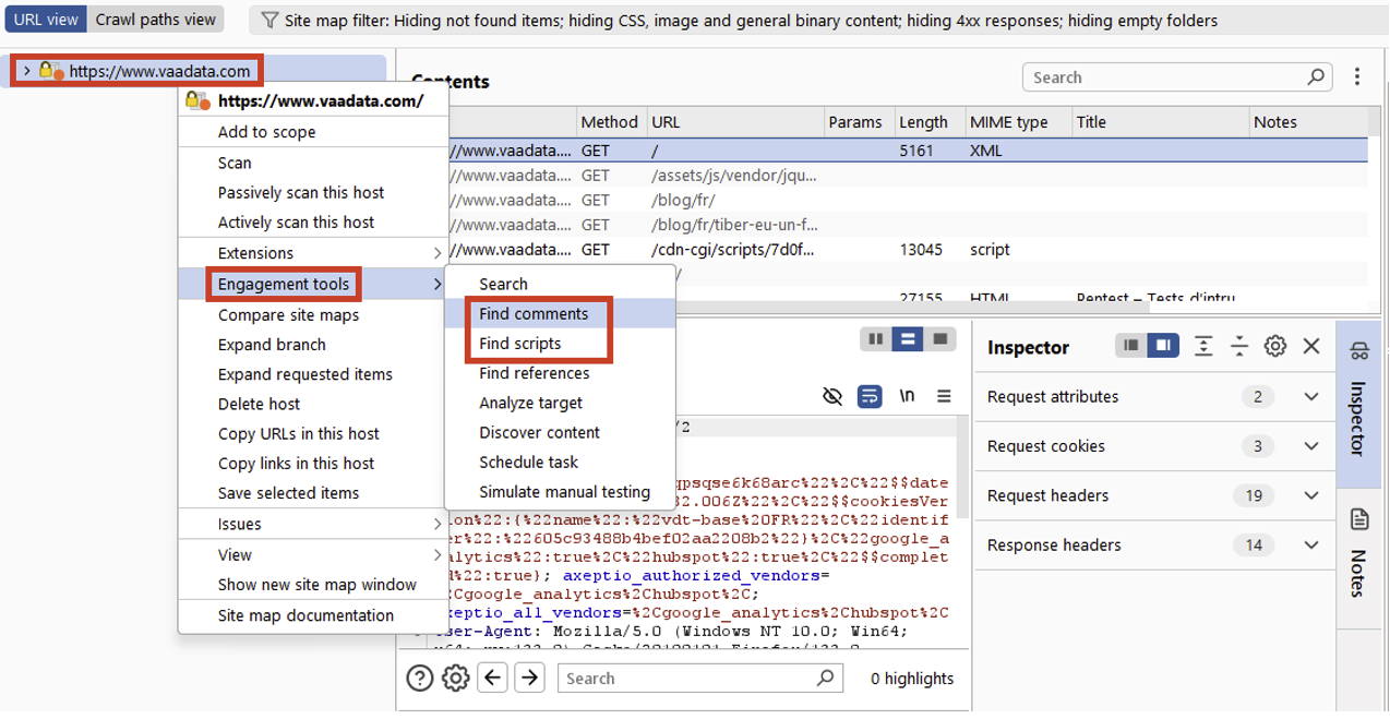 The ‘Find comments’ option allows you to list and export all the comments on the pages visited, while the ‘Find scripts’ option allows you to list and export all the scripts. These files can then be analysed to detect any secrets or sensitive information that may have been forgotten.