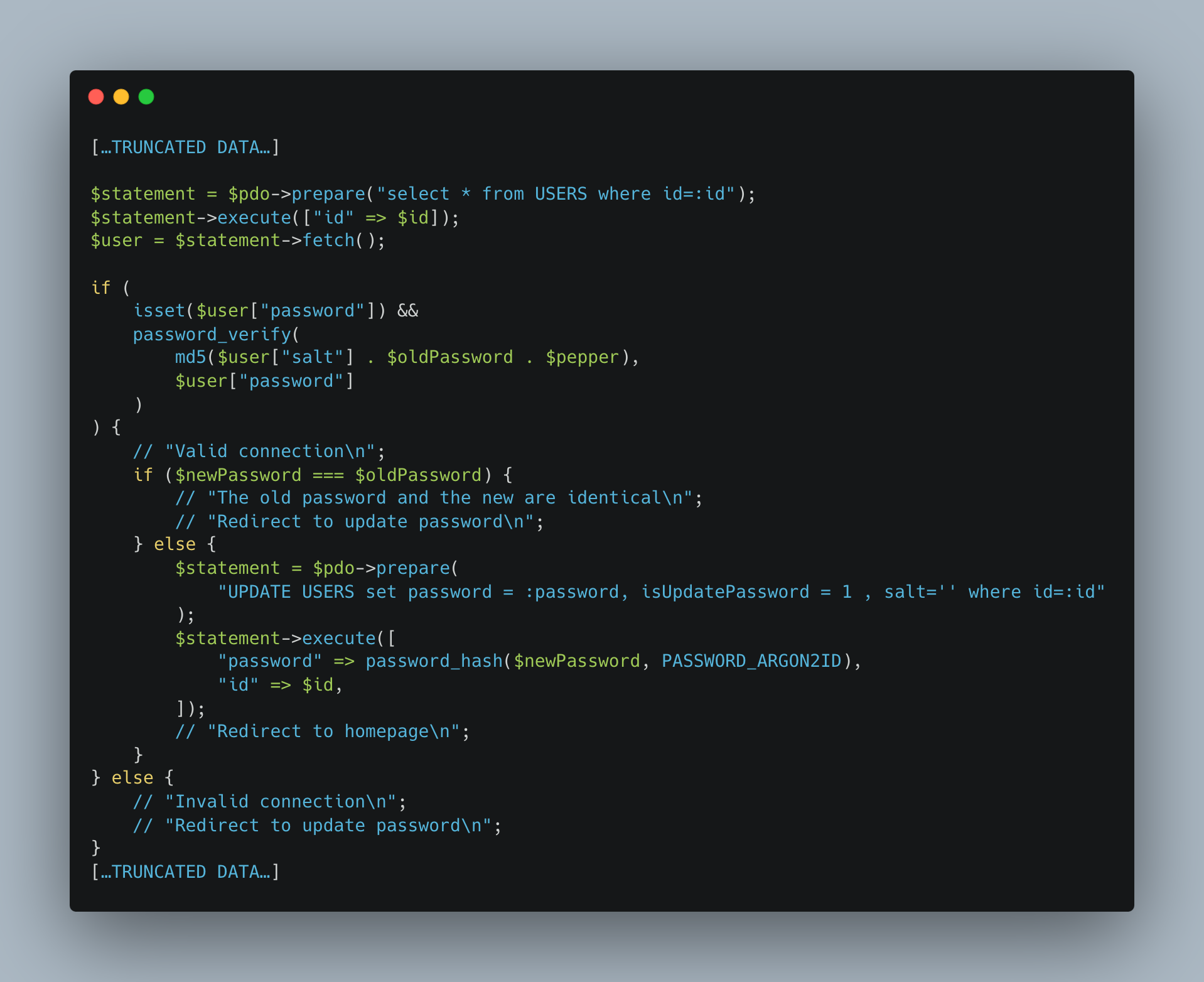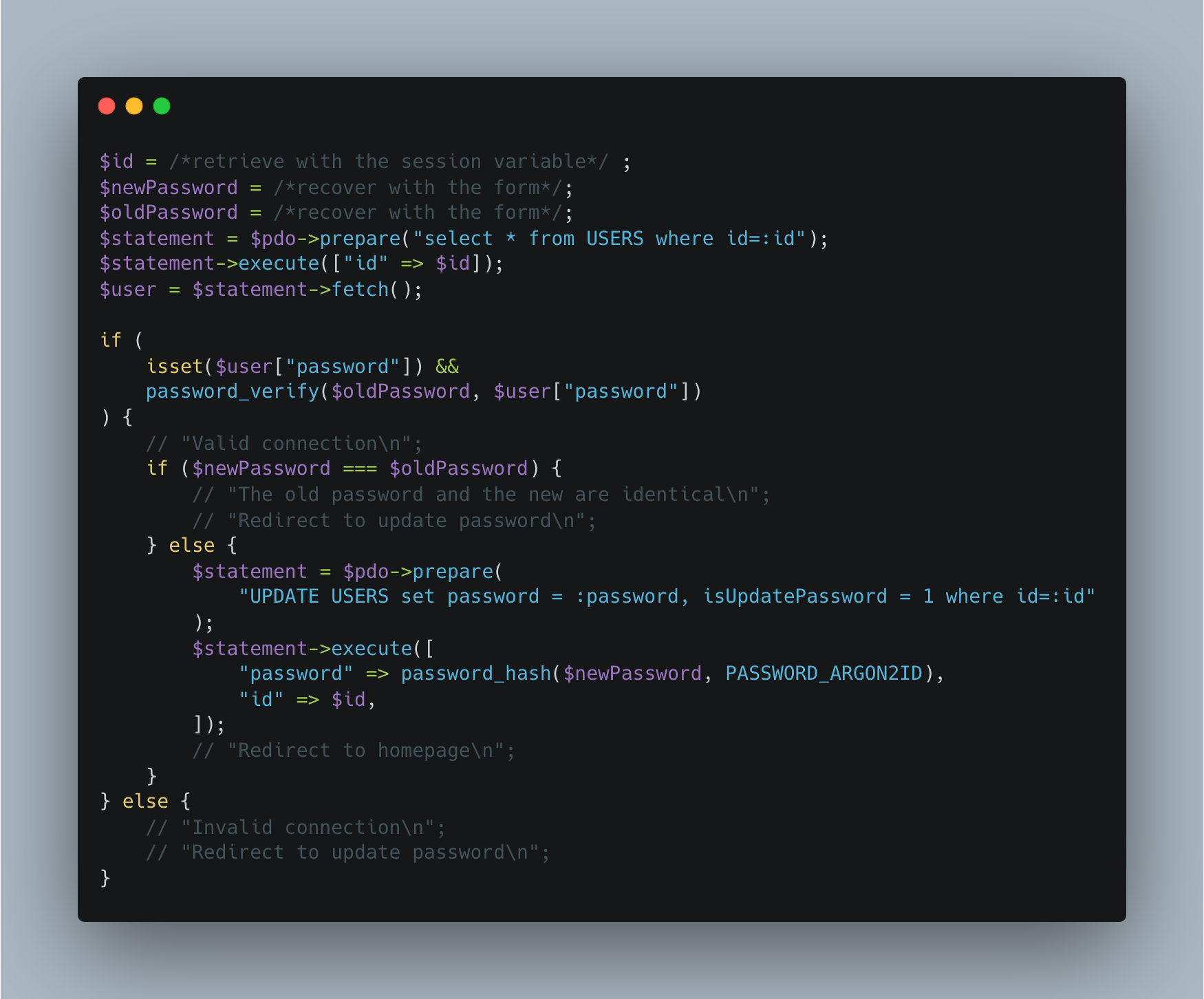 Note: Here we only check that the old password is different from the new one. Ideally, we should also check that the password follows a strong policy.