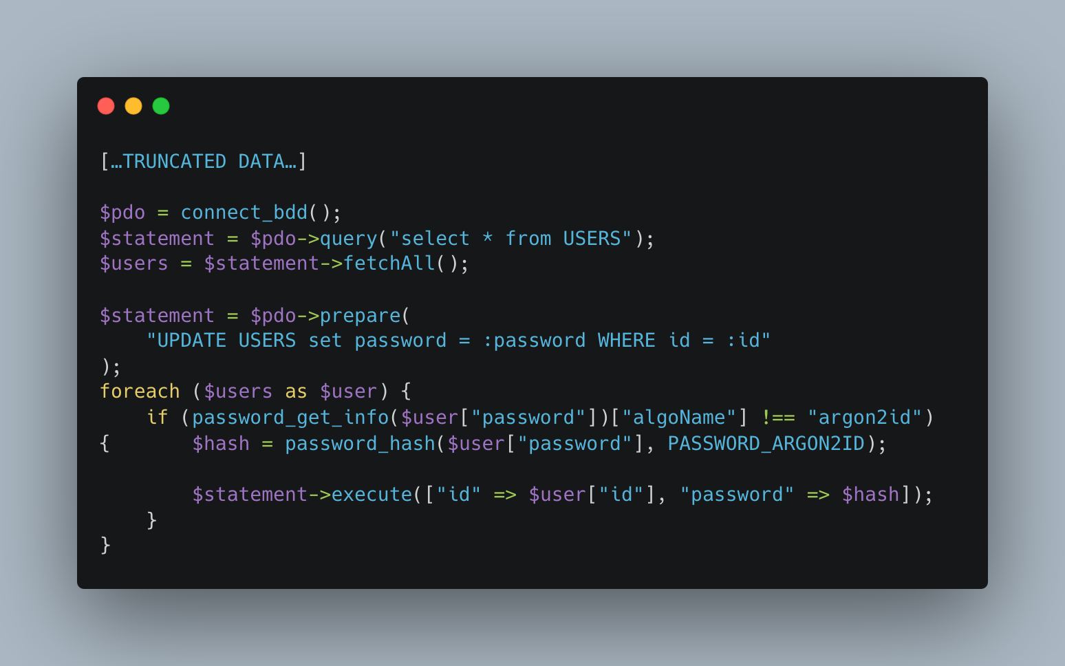 Thanks to the password_get_info function, only non-Argon2 passwords are transformed. This allows the script to be run several times without the risk of hashing the passwords several times.