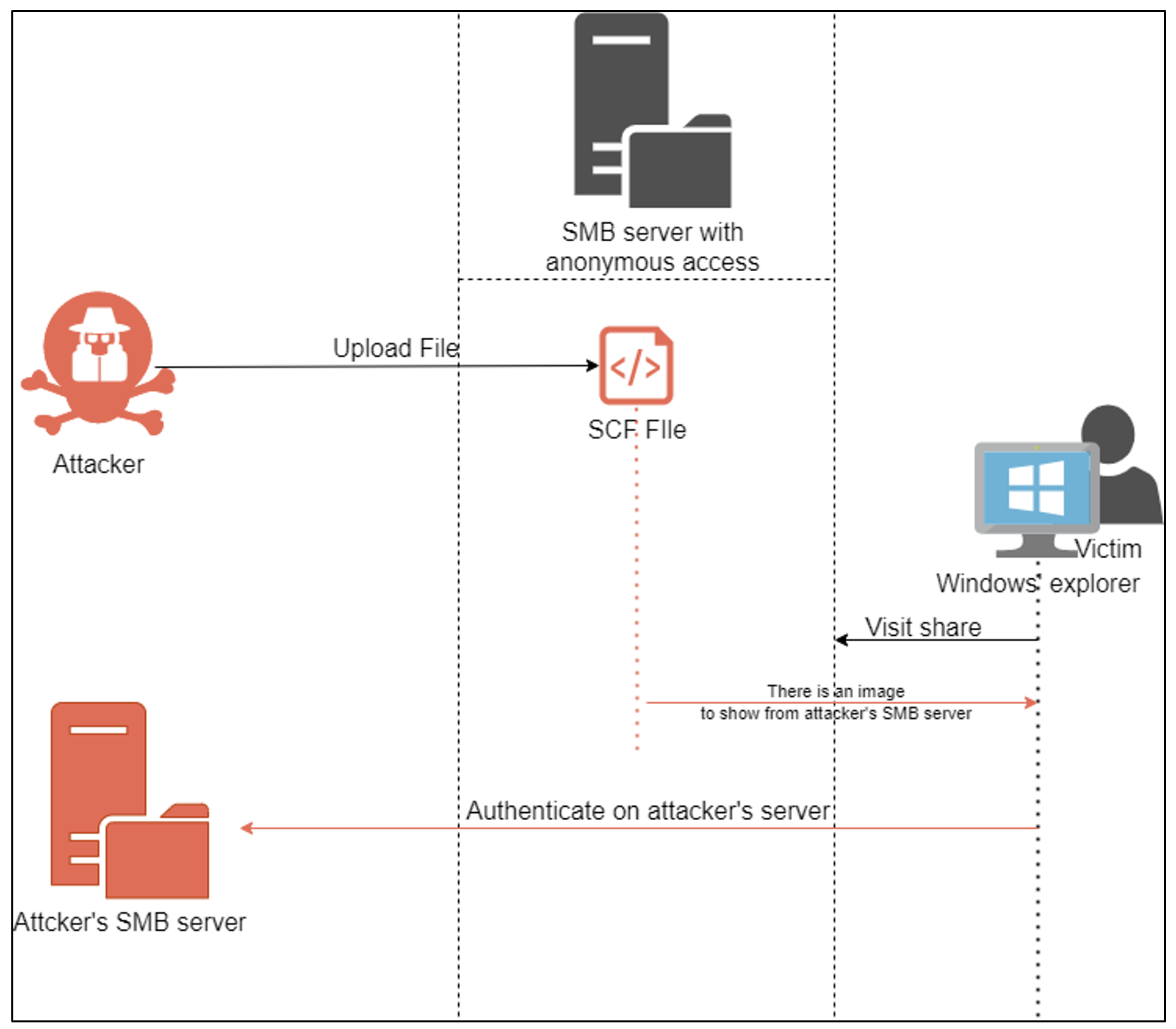Any user subsequently visiting the file share with Windows Explorer will attempt an SMB connection to a server controlled by the attacker. This connection will disclose a netNTLMv2 connection secret to the attacker. This secret can be used to calculate the user’s password.