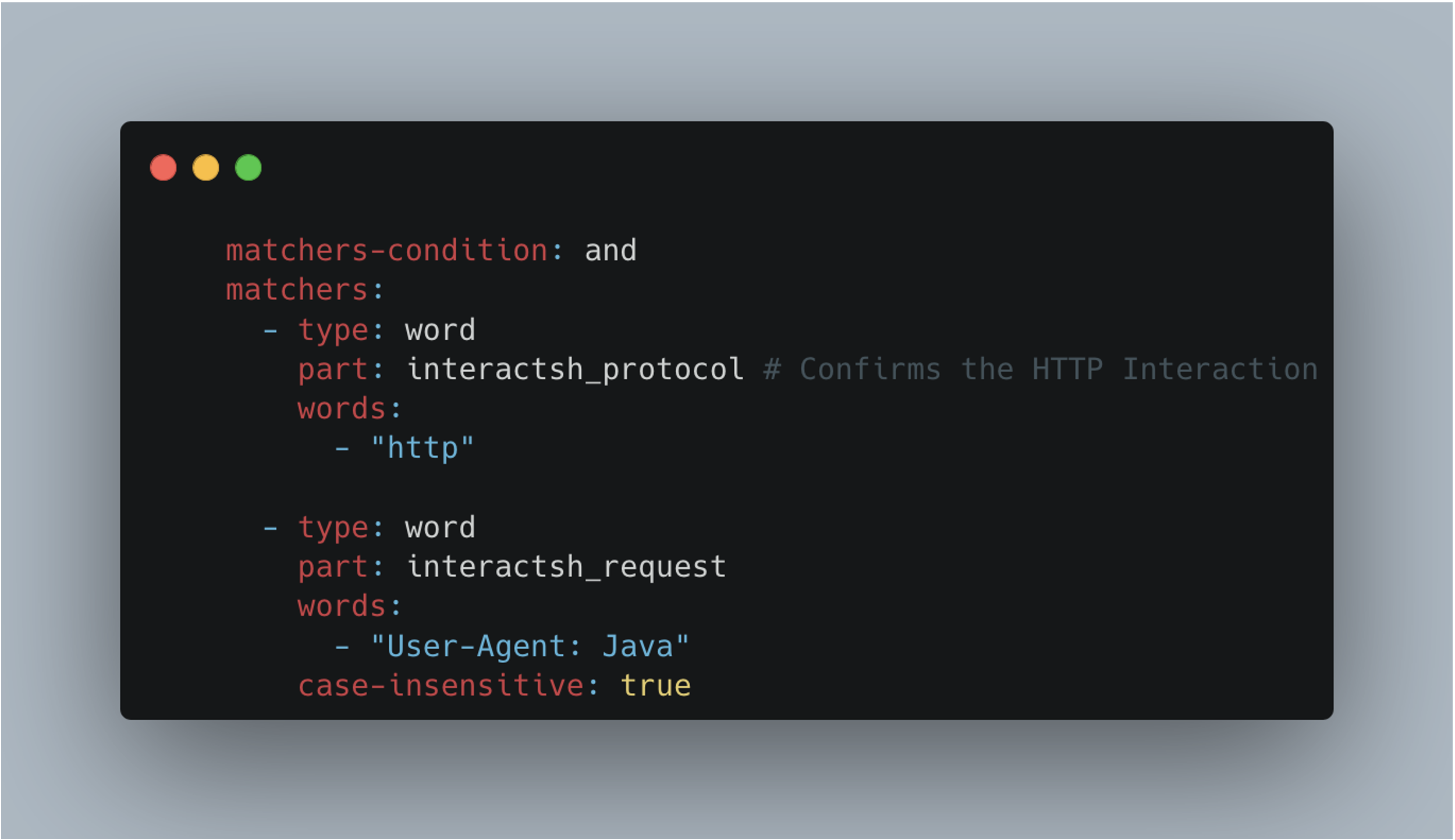 httpUser-Agent: Java is present in the request headers.We also note matchers-condition : and, indicating that both matchers must be validated for the target to be considered vulnerable.