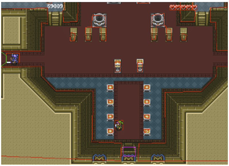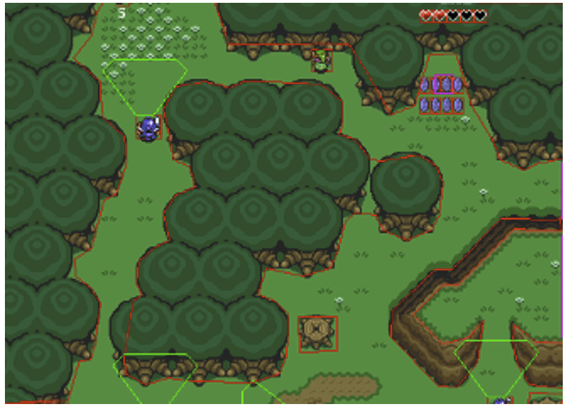 When we launch the game, we see our character, our health points and our money (we also see each hitbox, but that’s a detail). After hitting a few enemies, we’ve only got 2 hearts left and we’ve found 5 rubies.