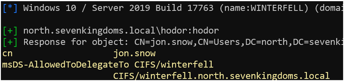 nxc ldap 192.168.56.11 -u hodor -p 'hodor' --query "(name=jon.snow)" "msDS-AllowedToDelegateTo cn"