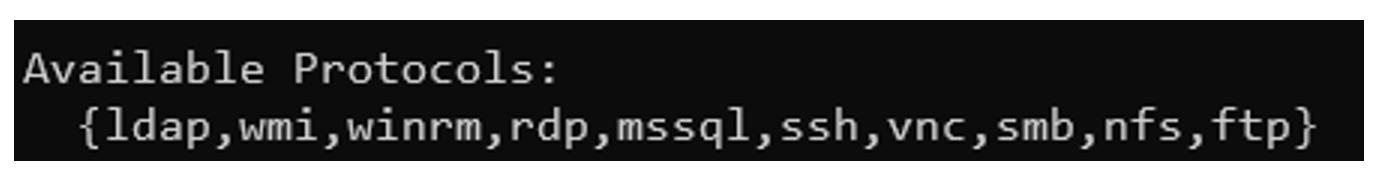 NetExec supports numerous protocols. The help command (nxc --help) displays a list of these protocols.