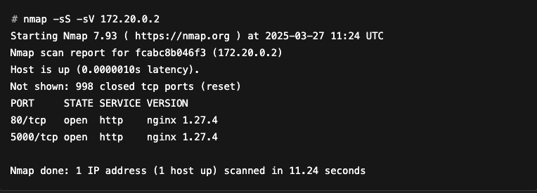 The results now display a new VERSION column, which indicates that the service listening on port 5000 is most likely a nginx HTTP server, version 1.27.4.