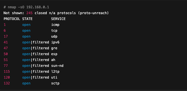 In this example, we can see that the ICMP (1), TCP (6), UDP (17) and SCTP (132) protocols are clearly open. Others, such as IPv6 (41), GRE (47) and ESP (50), appear as open|filtered, which means that Nmap cannot determine with certainty whether the protocol is authorised or simply filtered.