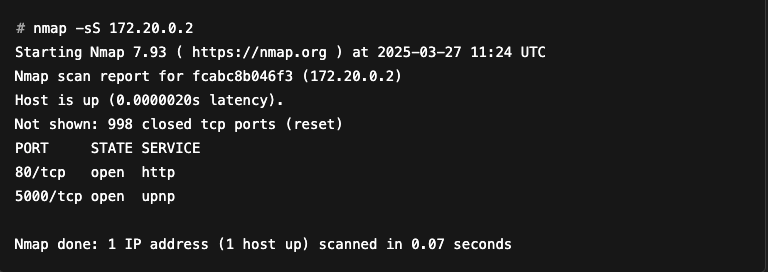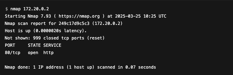 Before going into detail, let’s illustrate how Nmap works with a concrete example: scanning a host having an IP address of 172.20.0.2.