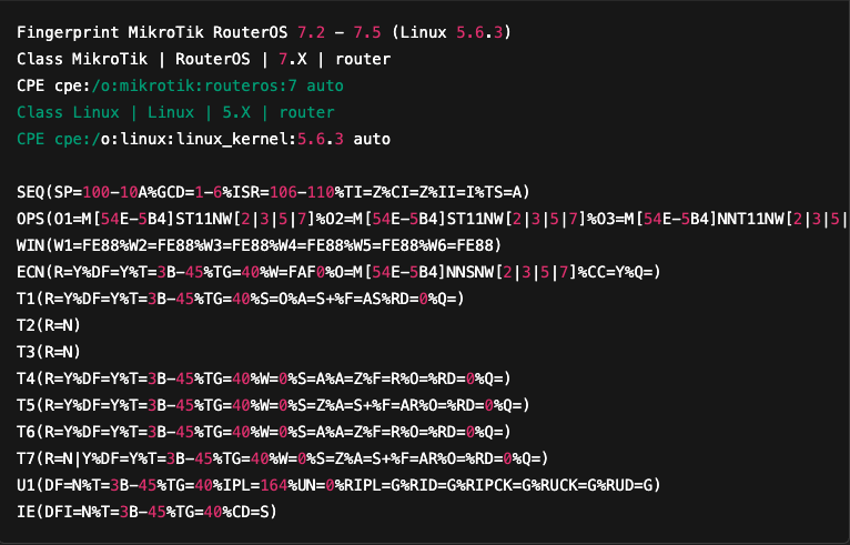 Let’s take the example of the reference fingerprint corresponding to “MikroTik RouterOS”, identified in the previous analysis. All reference fingerprints are stored in the nmap-os-db file.