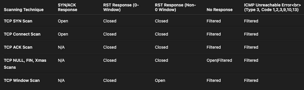 The table below summarises how the various TCP scanning techniques described above classify ports according to the responses they receive.