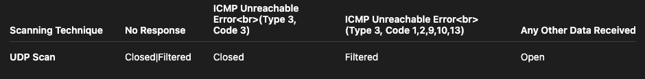 The table below summarises the cases encountered when using the UDP scan technique.
