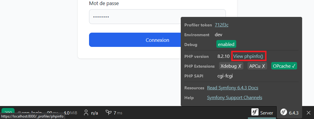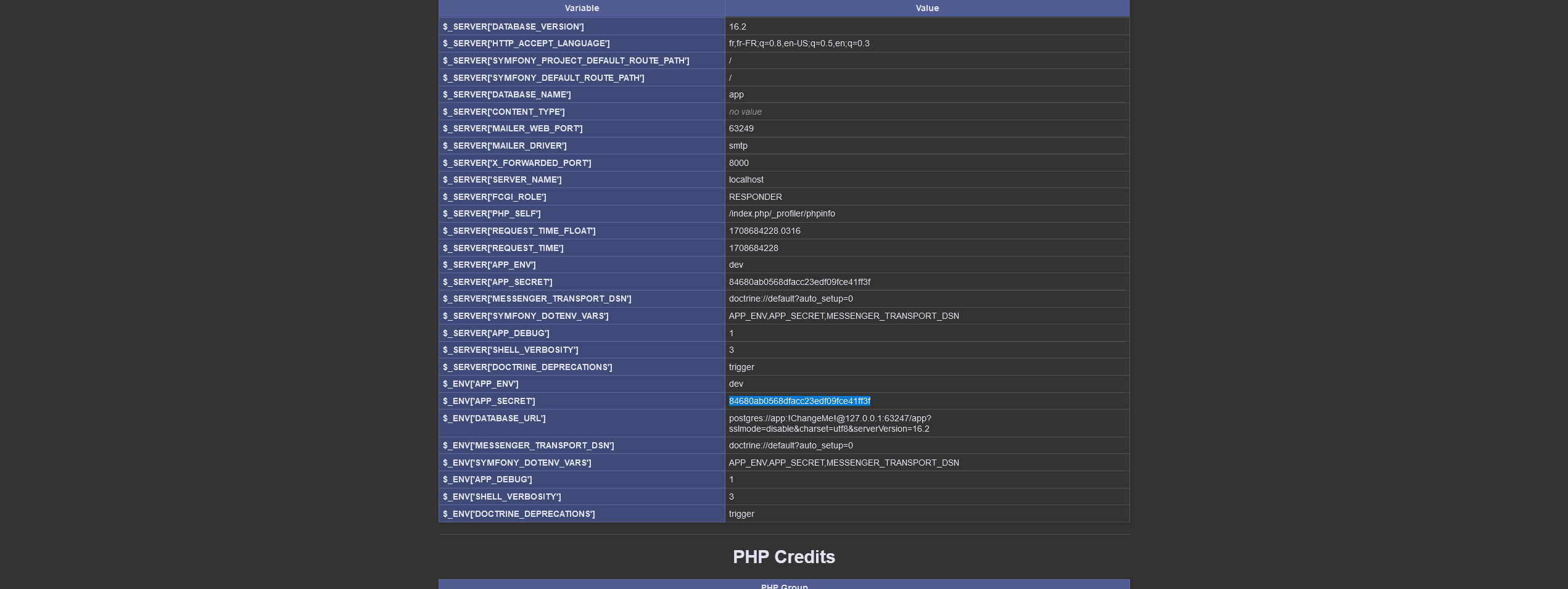 With the profiler, you can retrieve the application’s secrets. For example, this can be done using the toolbar by accessing the ‘View phpinfo()’ option, or directly at the following URL: https://yourdomain/_profiler/phpinfo.