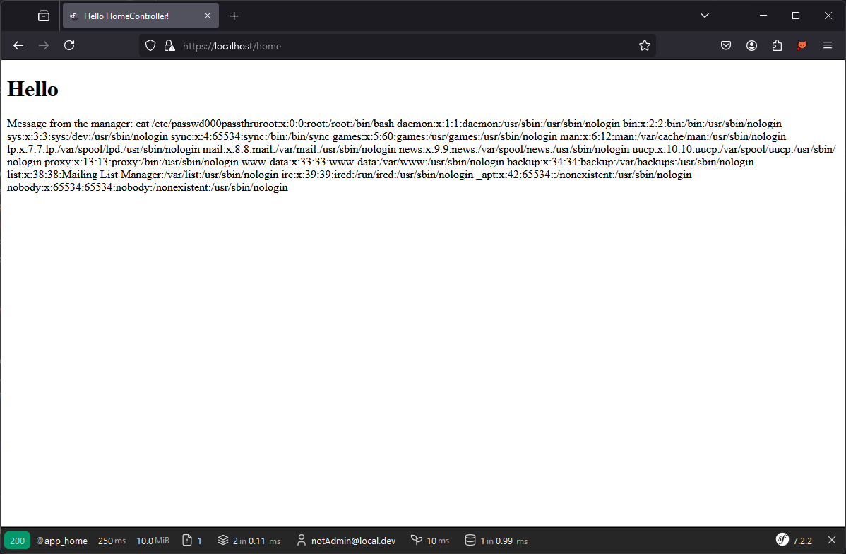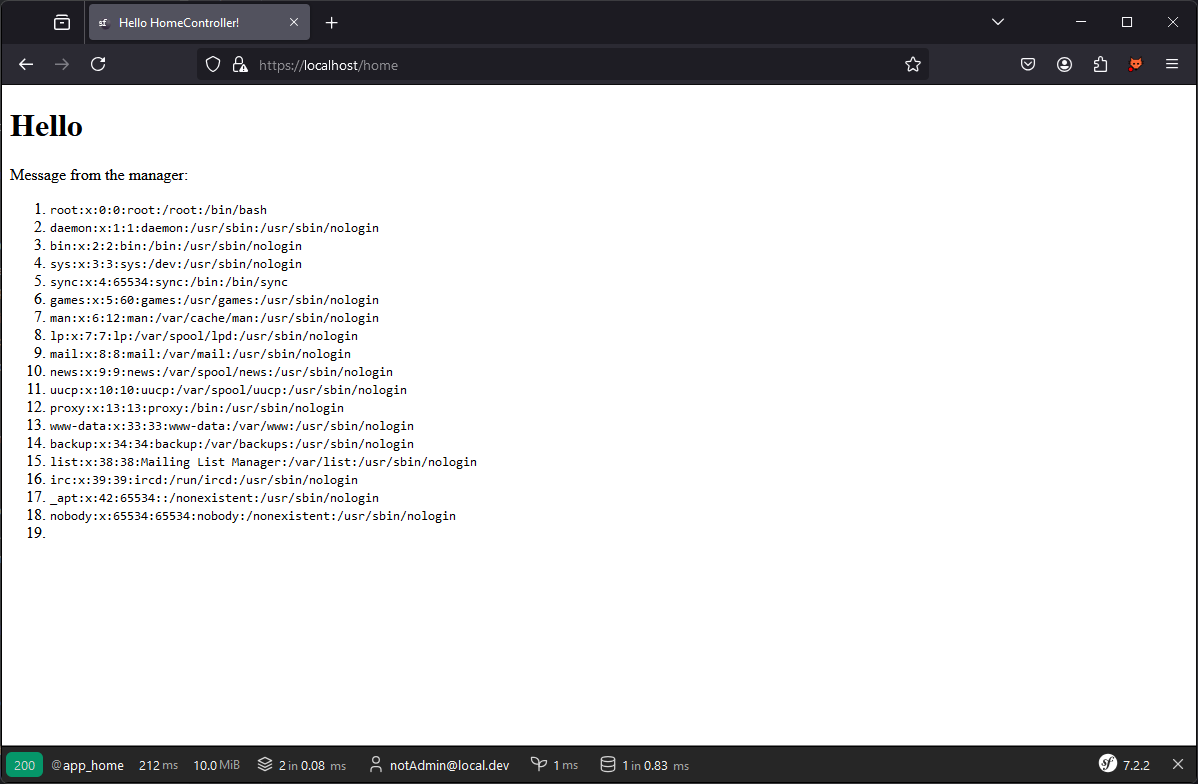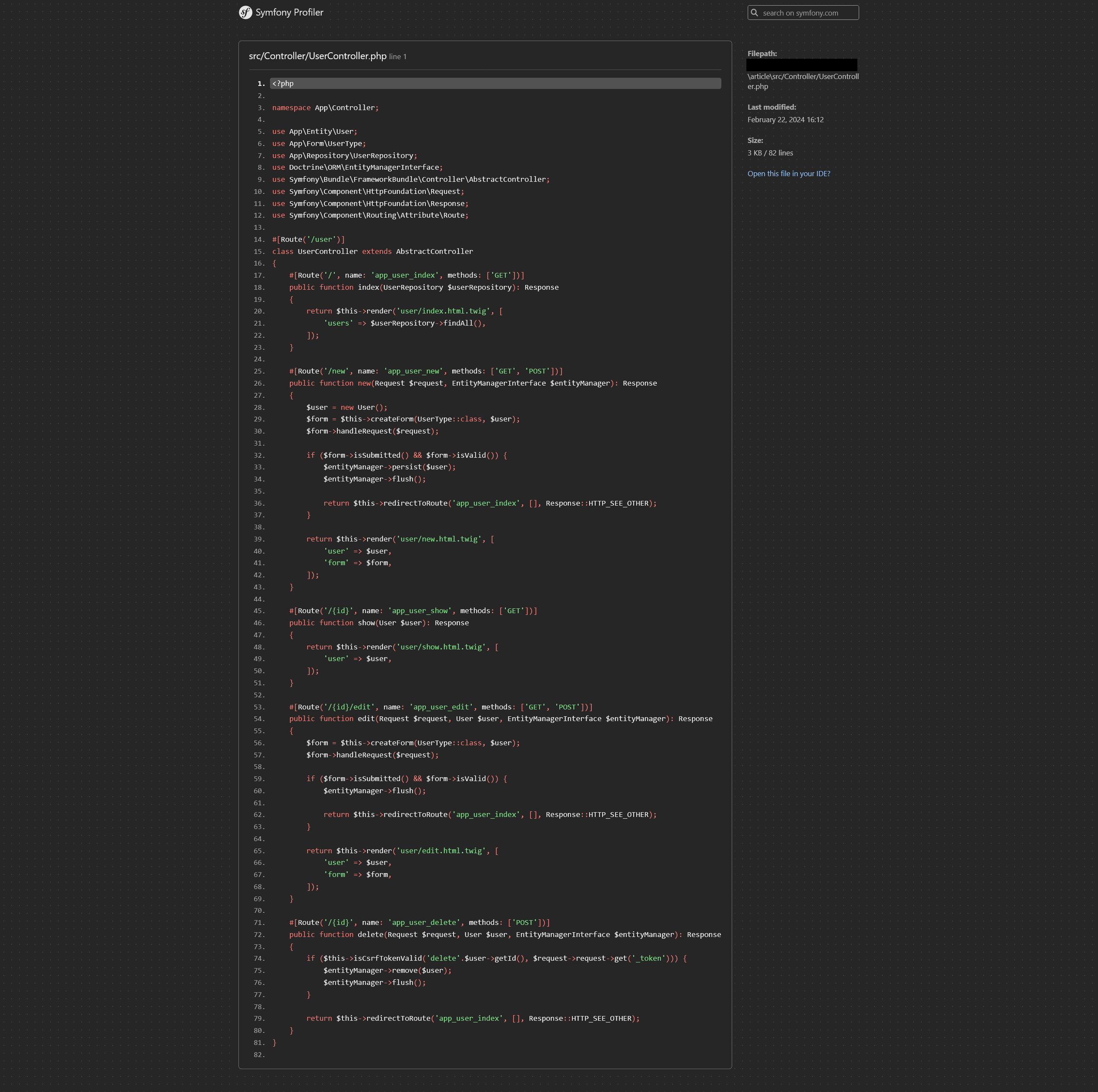 By exploiting the URL /_profiler/open with a valid file path and a specified start line, an attacker can access the contents of the project files. For example, the URL below can be used to read the source code of the UserController.