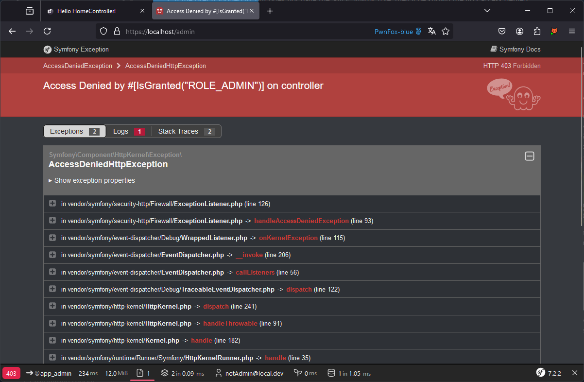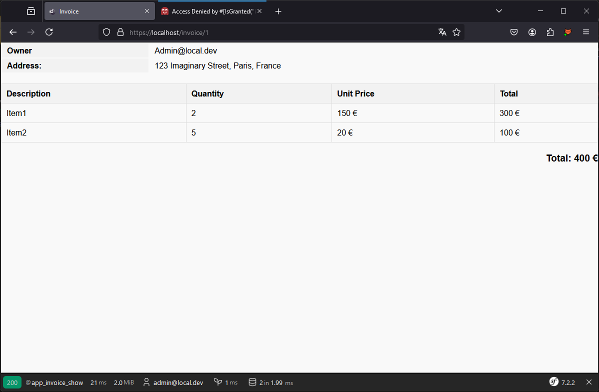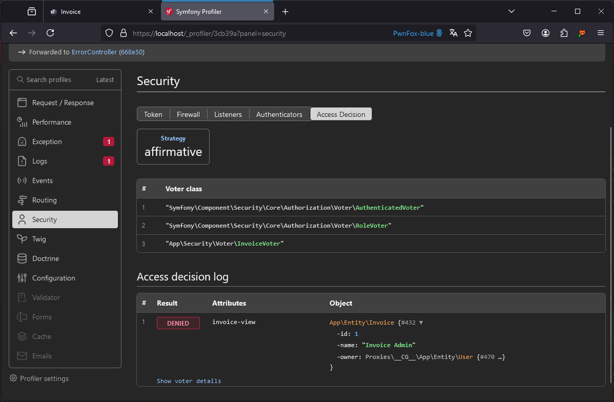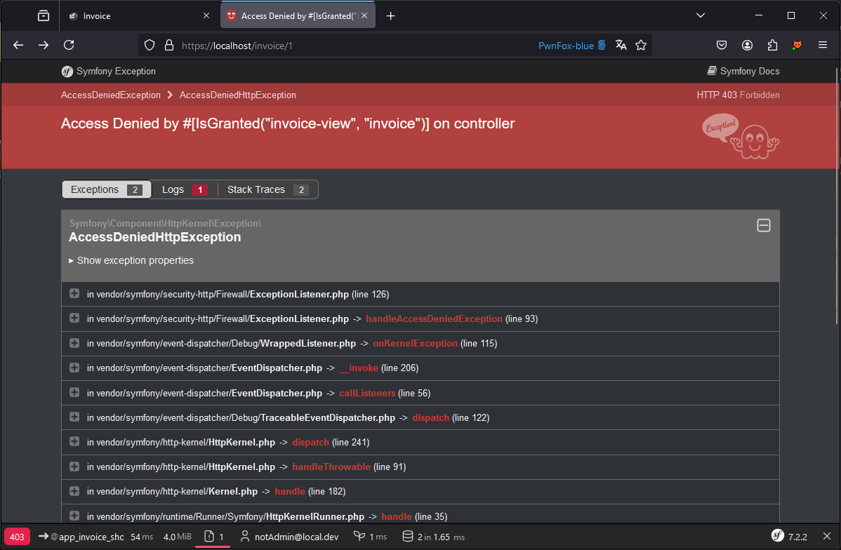 supports(): This method checks whether the voter should intervene for a given request. Here, the voter only applies if the attribute is invoice-view and the resource concerned is an invoice.voteOnAttribute(): This method contains the logic for determining whether the user is authorised to access the resource. For example, it checks whether the user is the owner of the invoice. If so, it returns true; if not, false.With this vote in place, a user such as notadmin will no longer be able to access resources belonging to admin.