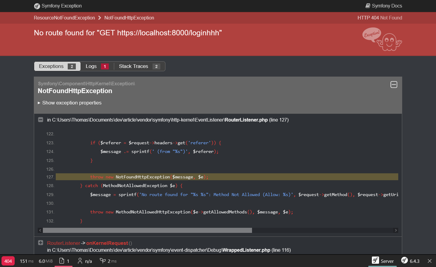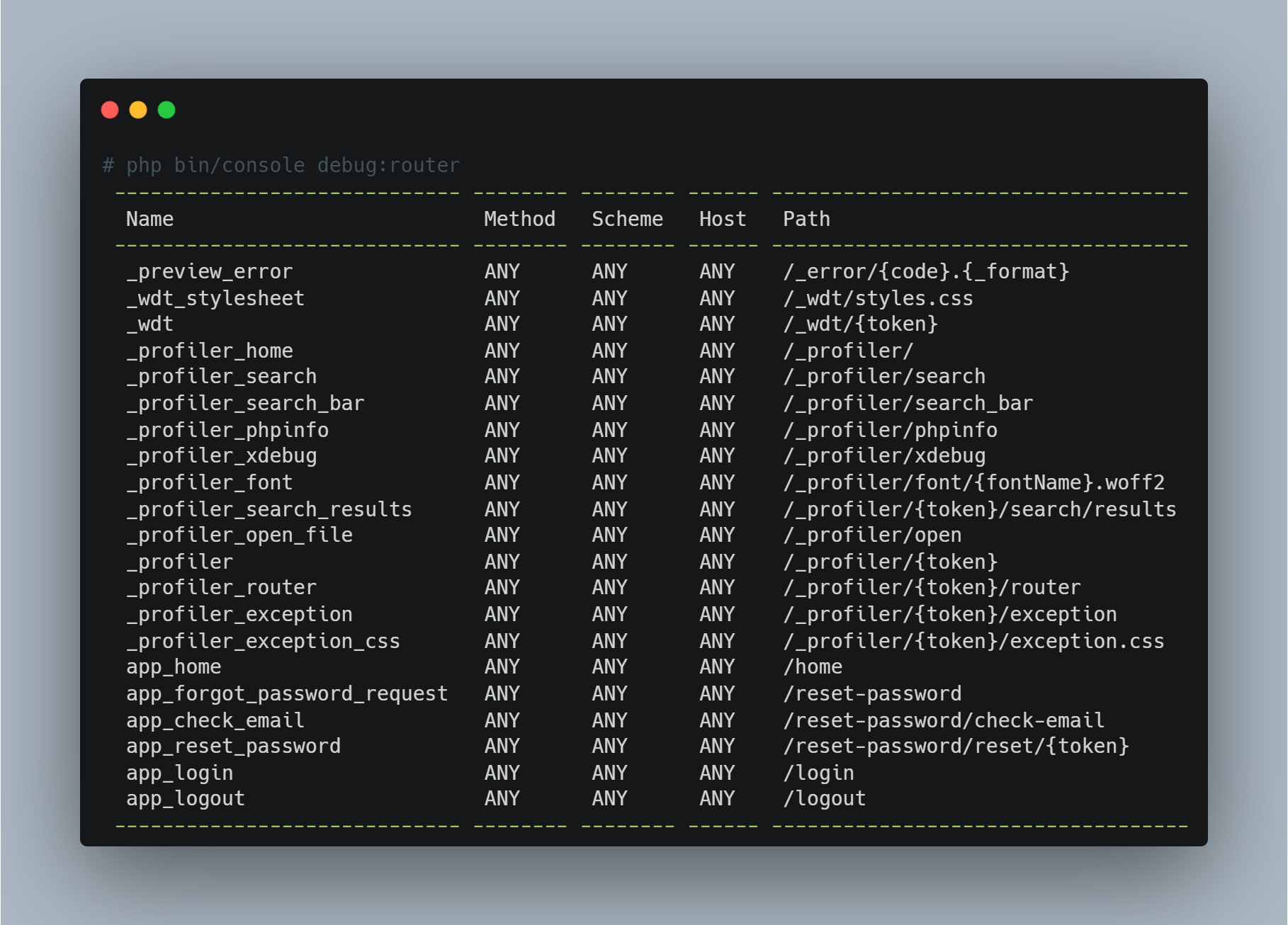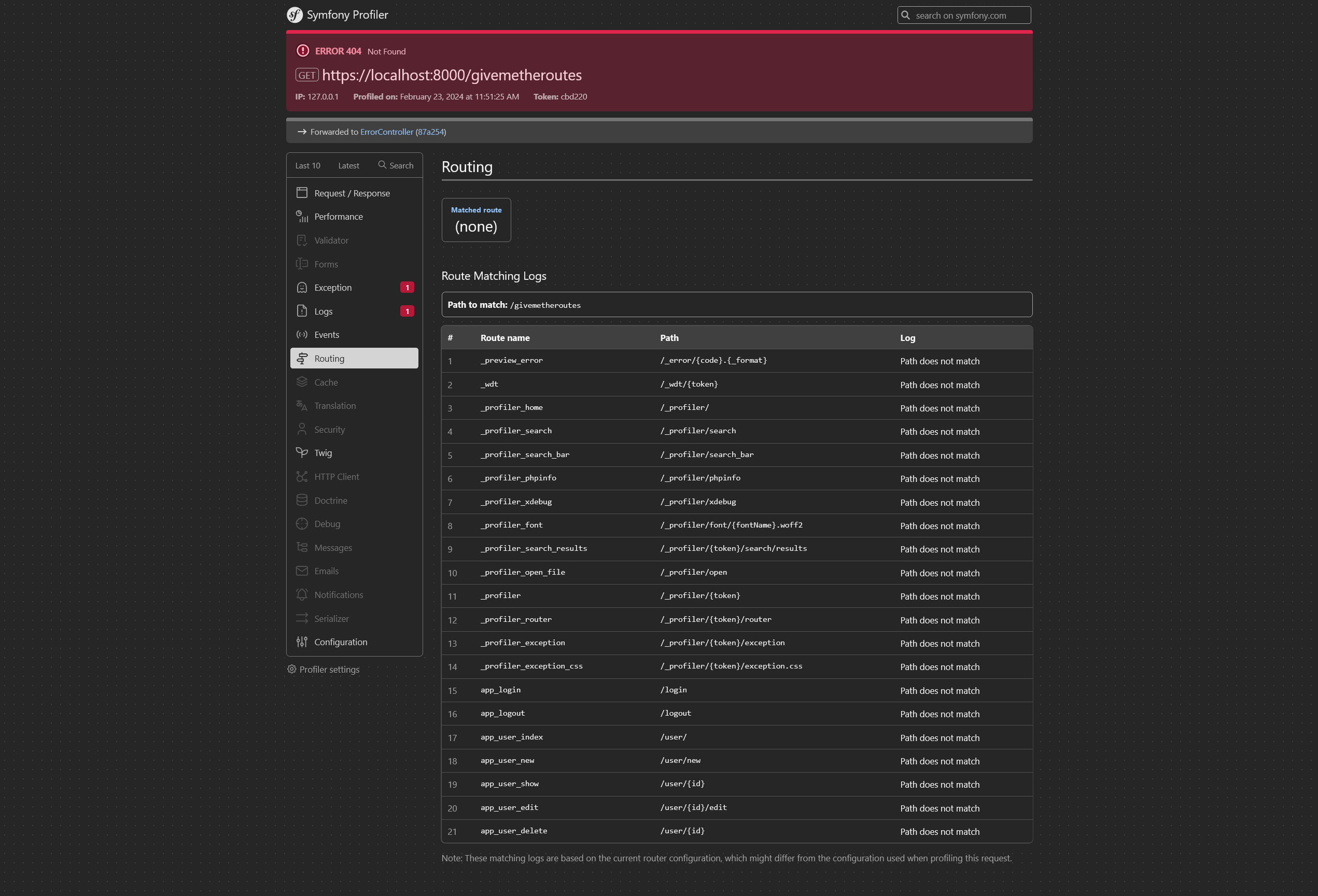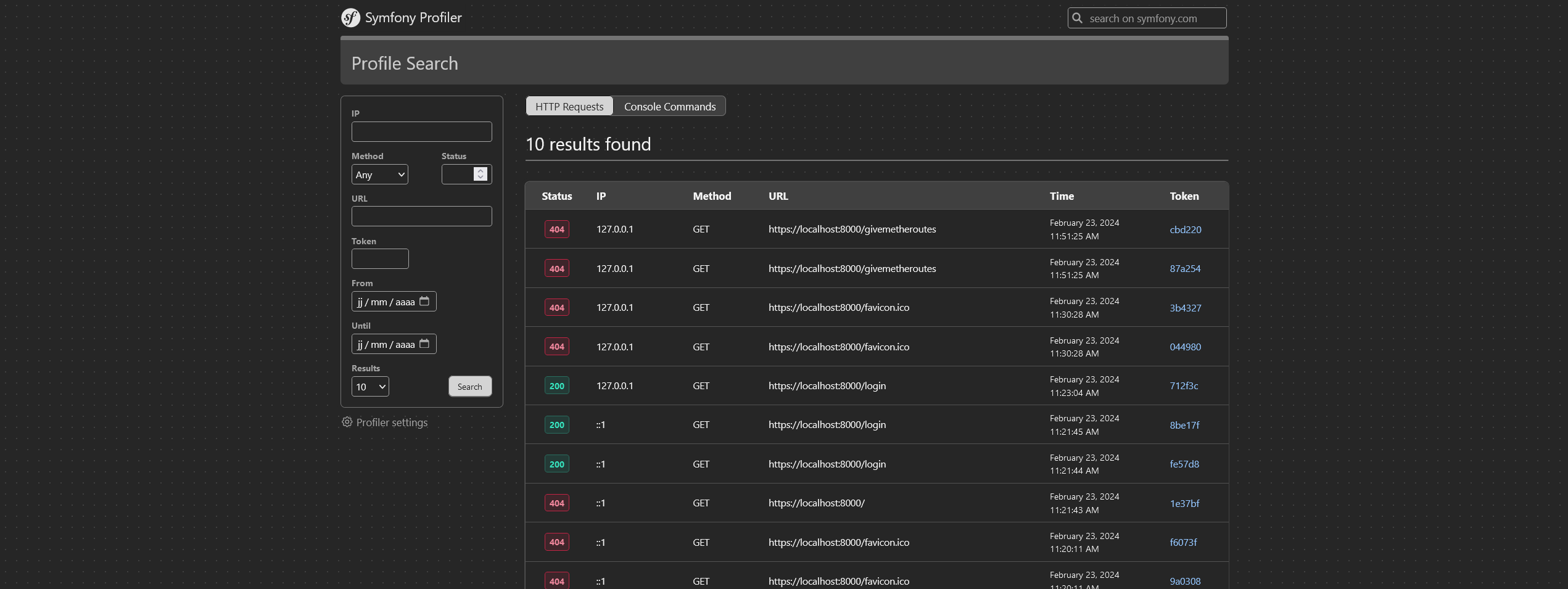 By exploiting the profiler on a request returning a 404 error, an attacker can access all the routes of the Symfony application.