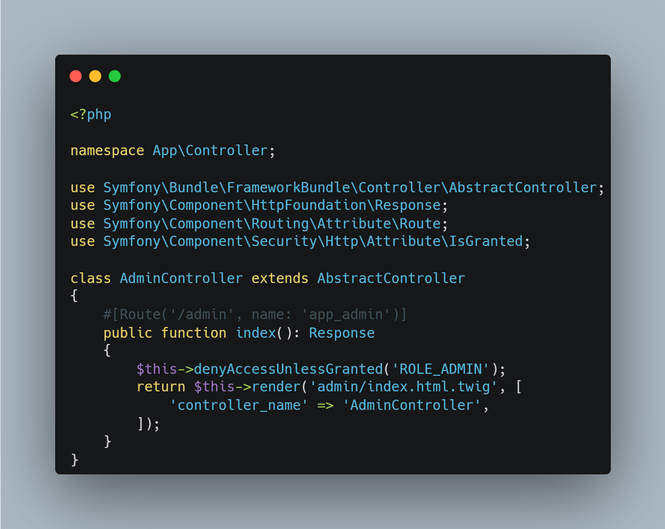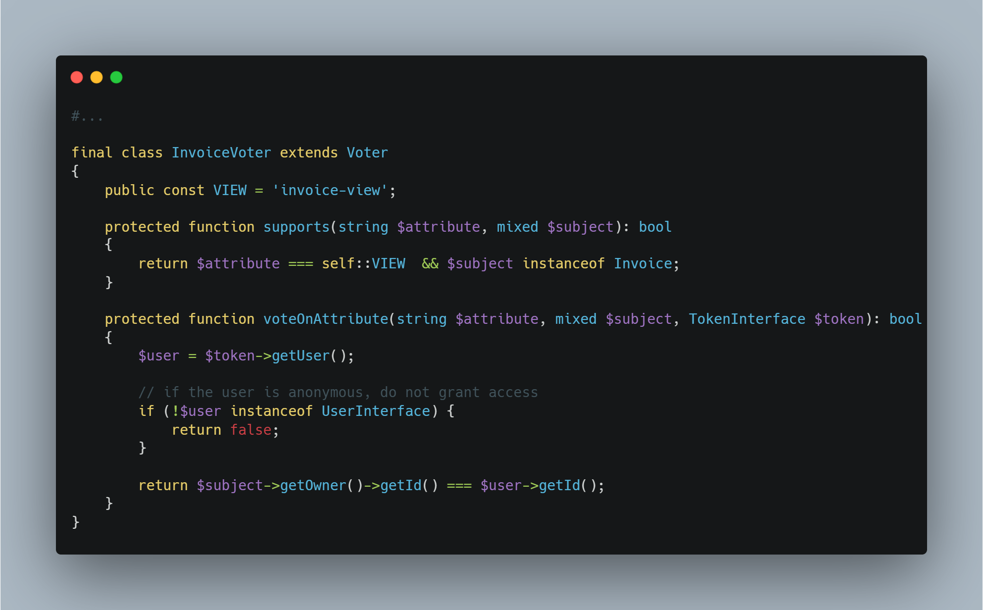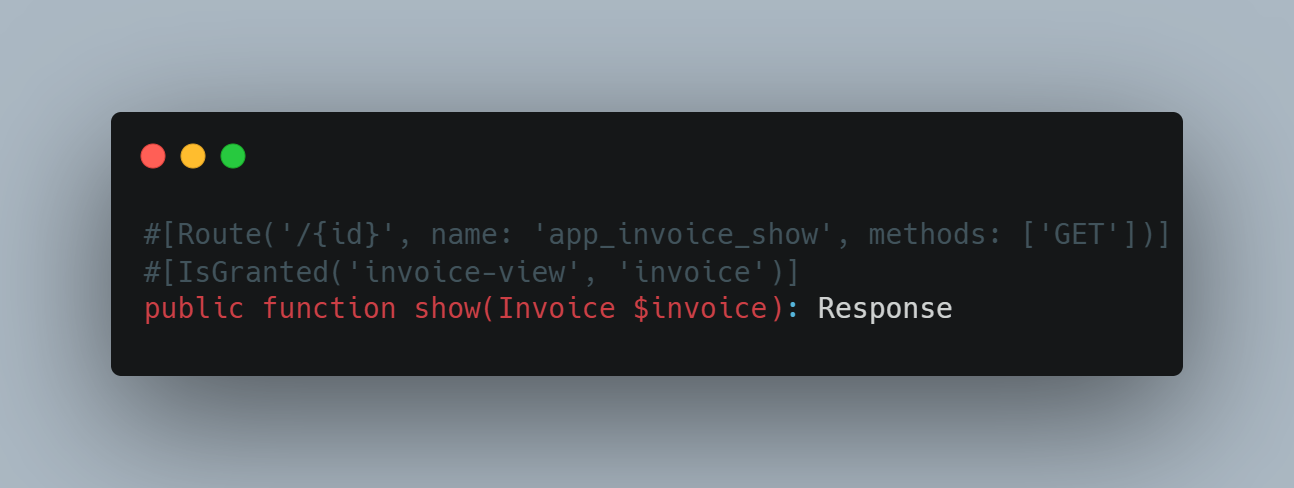 In this simplified example, the voter is designed solely to manage authorisation to view invoices. Although limited to this use, it provides a good illustration of how a Symfony voter works in general.