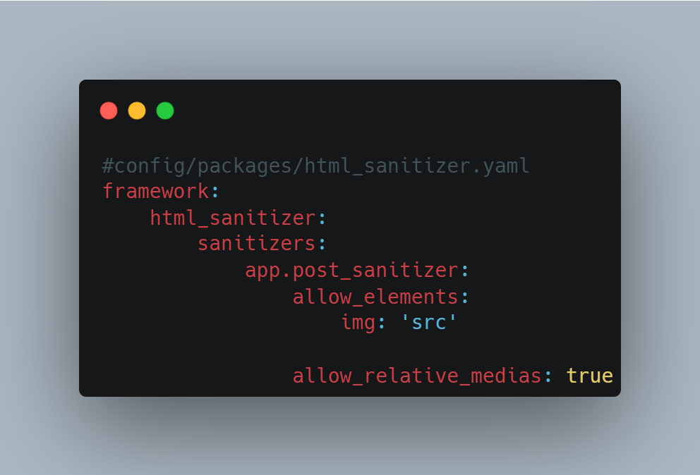 It is crucial to note that the security of your application depends largely on the configuration of the sanitizer. We therefore recommend that you limit this configuration to elements and attributes that are strictly necessary for the application to function properly.
