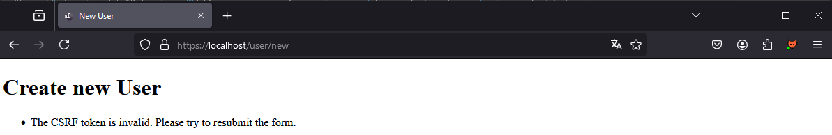 Natively, Symfony is protected against this type of attack, as shown by the following response after submitting the form: