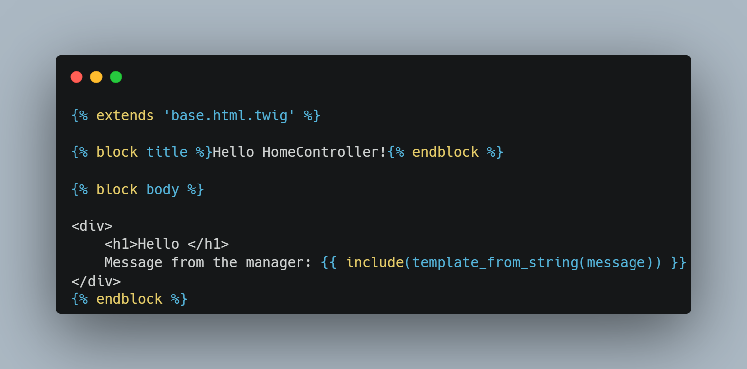 In our case, the manager submits a template via a form, which is then stored in the database. This message is then retrieved and Twig rendered on it.
